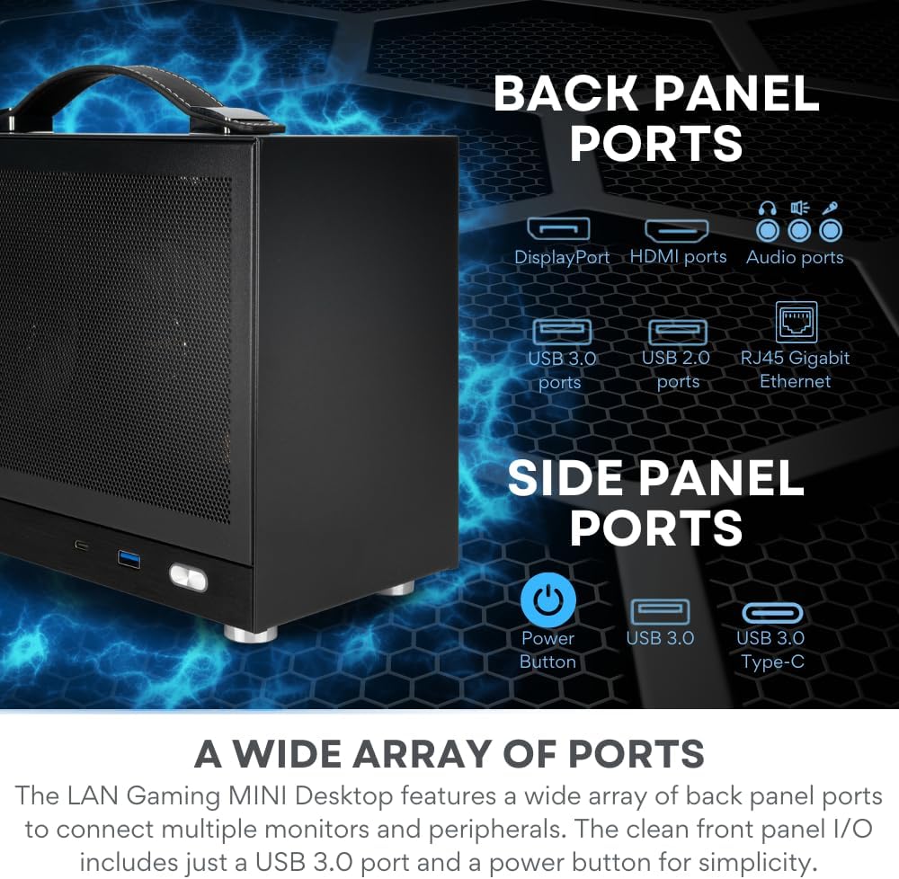 The LAN Gaming MINI Desktop features a sleek, modern design with sleek side panel I/O ports. The bank panel offers multiple HDMI, USB ports, Displayport, audio and Ethernet ports.