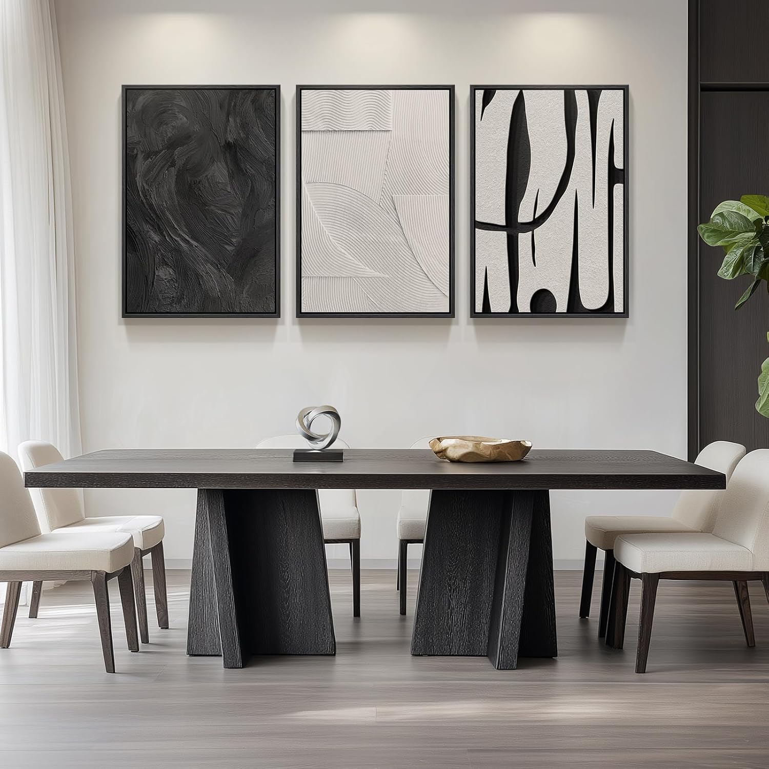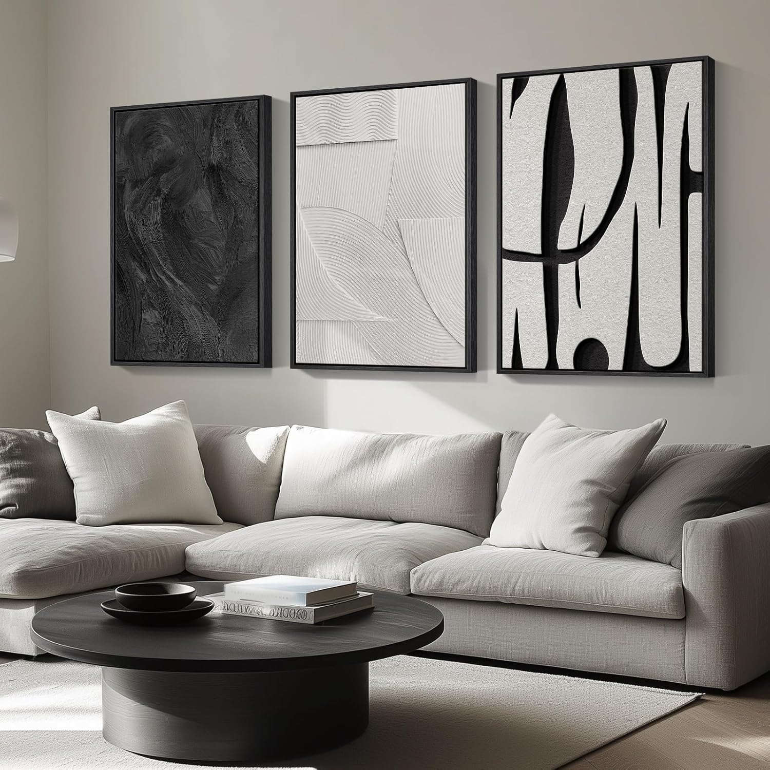 [Framed Wall art]: A set of 3 large contemporary minimalist black and white abstract wall art each 24×36 inches, 3 pieces totaling 36″ H x 72″ W. The frame is sturdy and the simple and stylish black frame blends perfectly with a variety of decorative styles