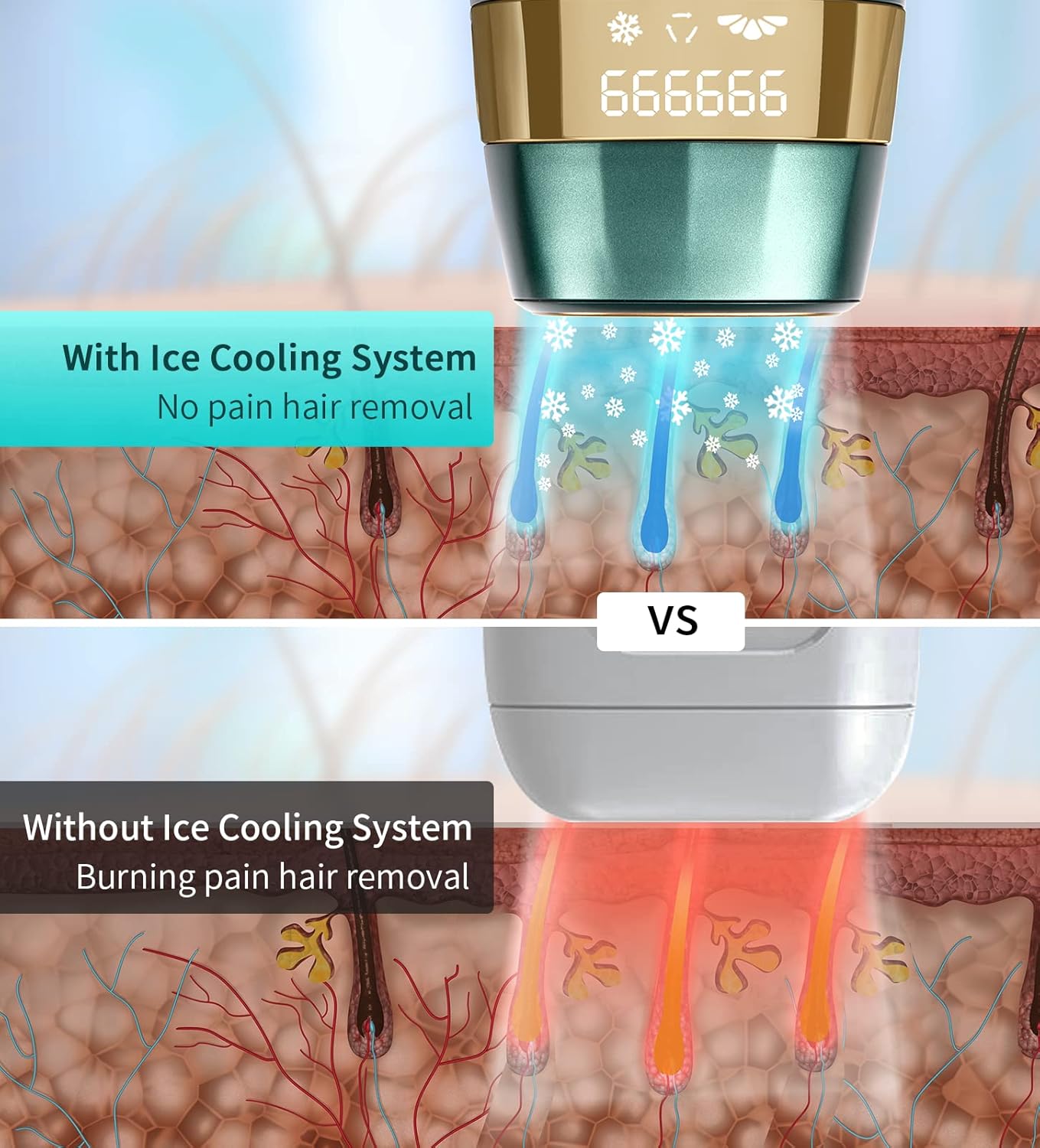 【Gentle & painless】The at-home hair removal device adopts advanced built-in cooling technology, which can relieve the burning sensation caused by higher energy levels. It takes around 10 seconds for the cooling system to cool down.(Note: even for the same power level, burning sensation may vary from person to person).And Hair removal emits a warm light and the skin only feels mild heat. It is very gentle.