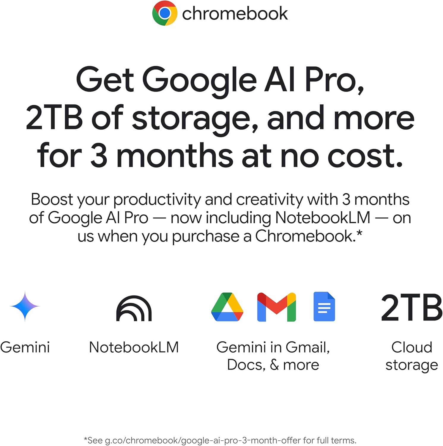 GET GOOGLE AI PRO, 2TB OF STORAGE, AND MORE FOR 3 MONTHS AT NO COST – Boost your productivity and creativity with 3 months of Google AI Pro –now including NotebookLM– on us when you purchase a Chromebook.(1)
