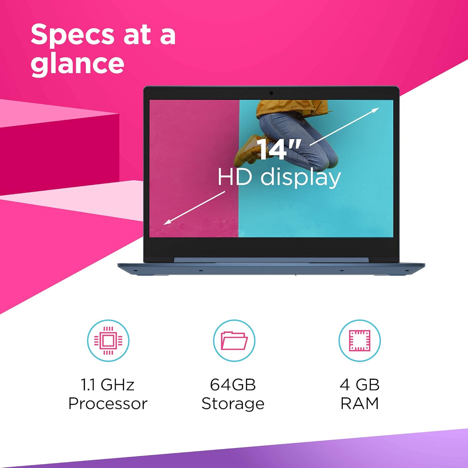 Lenovo IdeaPad 1 14 Laptop, 14.0″ HD Display, Intel Celeron N4020, 4GB RAM, 64GB Storage, Intel UHD Graphics 600, Win 10 in S Mode, Ice Blue