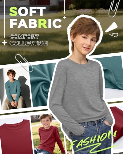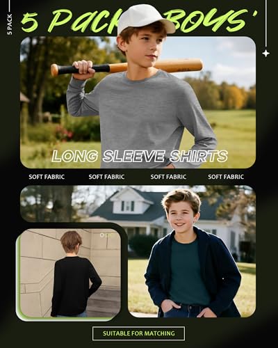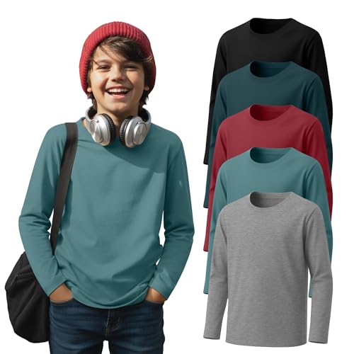 LessonZoo 5 Pack Boys’ Long Sleeve Shirts 3-16 Years, Crew Neck Thermal Youth T-Shirts Kids’ Fall Baggy Casual Solid Tops(Light Gray, Turquoise, Tomato Red, Dark Gray Green, Black,9-10y)