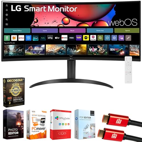 LG 34SR65QC-B 34 Inch Smart Monitor WQHD 1440P Curved Screen with Adjustable Stand Bundle with Elite Suite 18, 2X HDMI Cable and Deco Gear CPS Exclusive 26 Month Protection Pack (BEACH-CPS-26M500)