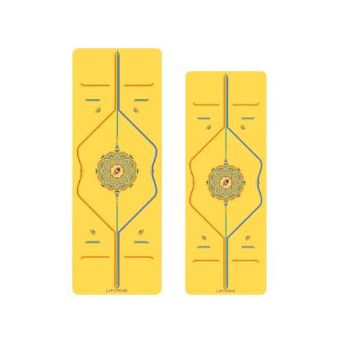 LIFORME Printed Yoga Mat & Travel Mat Bundle Pack – Patented Alignment System, Eco-Friendly, Non-Slip Warrior-Grip, Made with Natural Rubber, Thick, Sweat Resistant, Comfortable – Yellow/Yellow