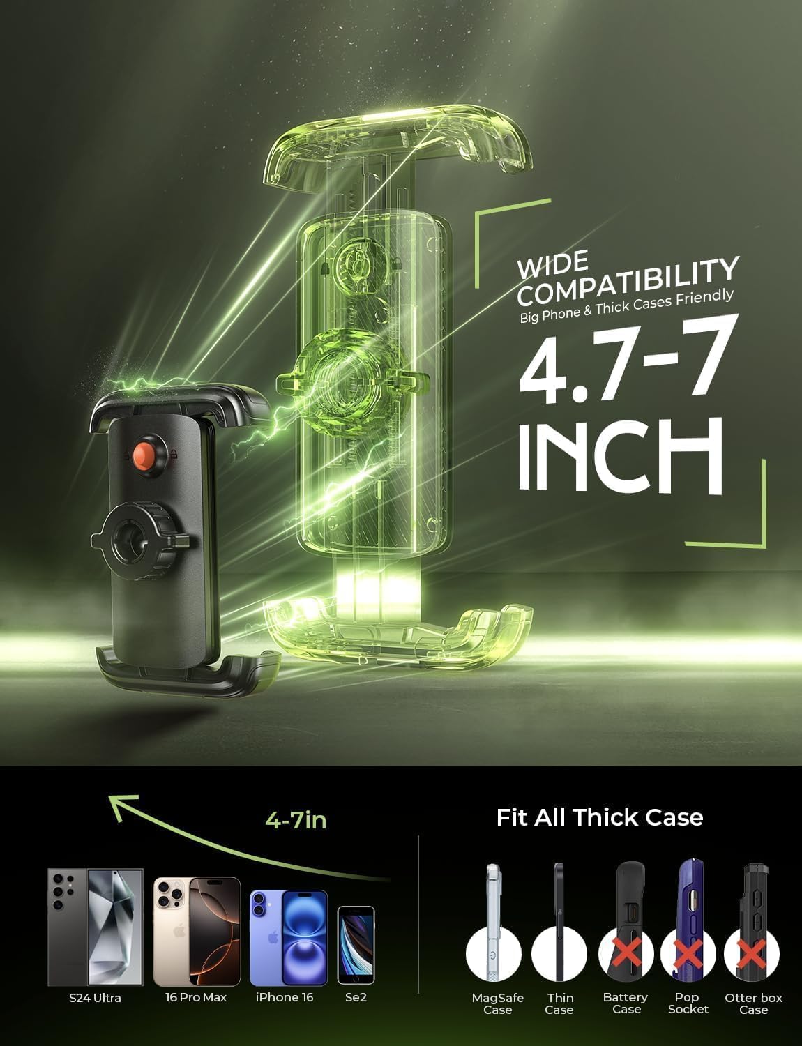 [Wide Compatibility for Phones] Universal phone holder for bike in the market is adjustable for 4.7-6.8″, thickness up to 15mm (including phone case), but LISEN ebike phone holder fits cell phones 4.5-7″, thickness up to 20mm, fits nearly all phones, Such as iPhone 16 Pro Max, Samsung Galaxy S24 Ultra.