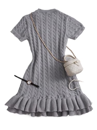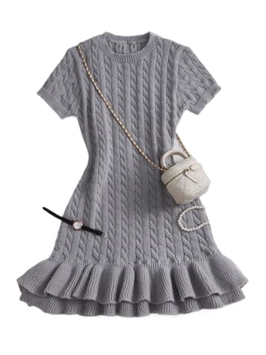 LOOBIS Women’s 2025 Casual Sweater Dresses Solid Color Round Neck Short Sleeves Ruffle Hem Slim Knit Dress
