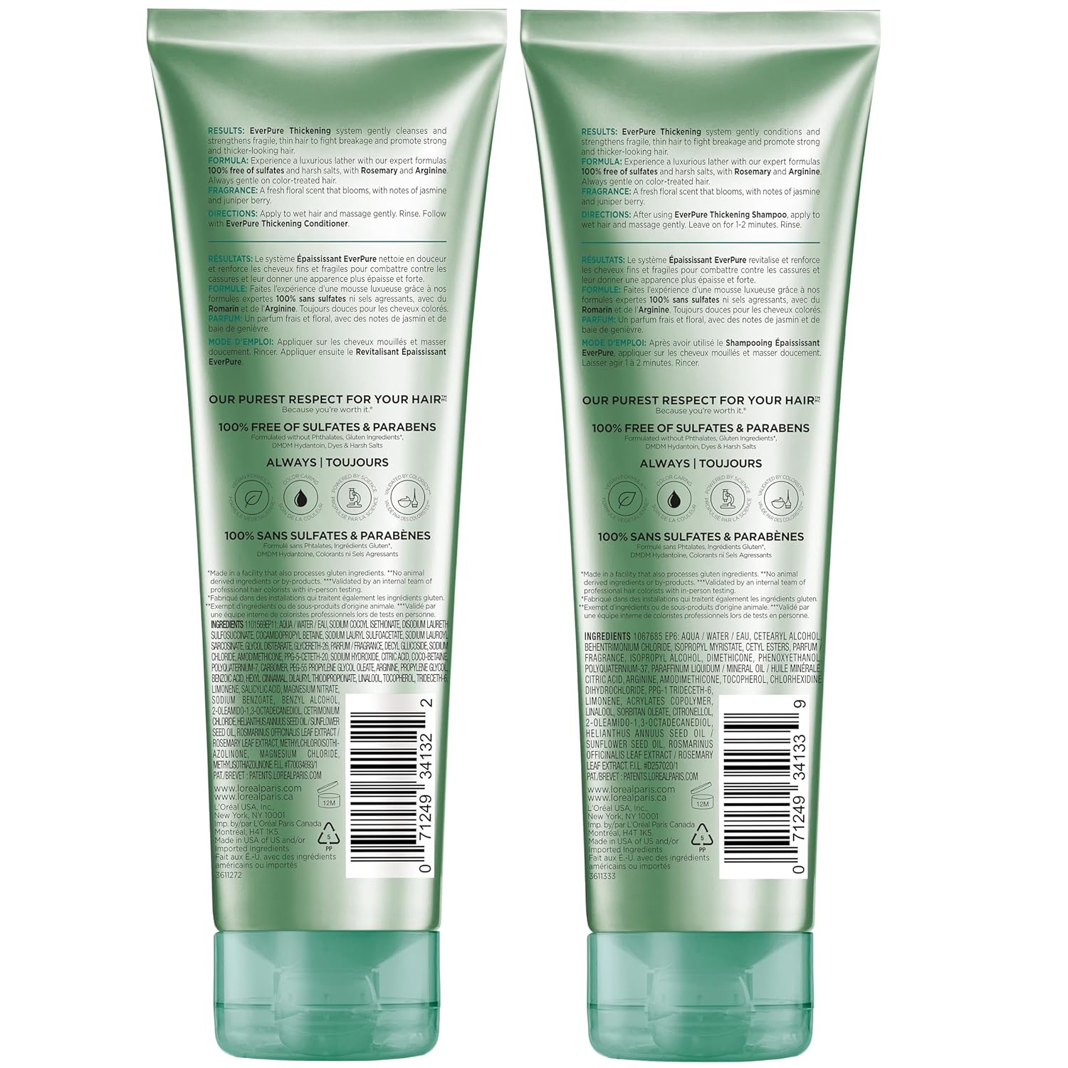 L’Oreal Paris EverPure Thickening Sulfate Free Shampoo and Conditioner hydrates and fortifies fine hair for thicker looking hair after the 1st wash. The system injects strength, reinforcing hair to be 15X stronger*. Strengthening Rosemary leaf leaves thin hair looking full and healthy. Our formulas are especially gentle on color treated hair. There are no harsh sulfates, salts or surfactants that can strip, dull and damage hair. Experience a purely sensorial lush, luxurious lather and a fresh aromatic fragrance that conditions. For best use, apply EverPure Thickening shampoo to wet hair and massage gently into a thick lather. Rinse thoroughly. Follow with EverPure Thickening conditioner. *System of shampoo, conditioner, and treatment vs. non-conditioning shampoo.