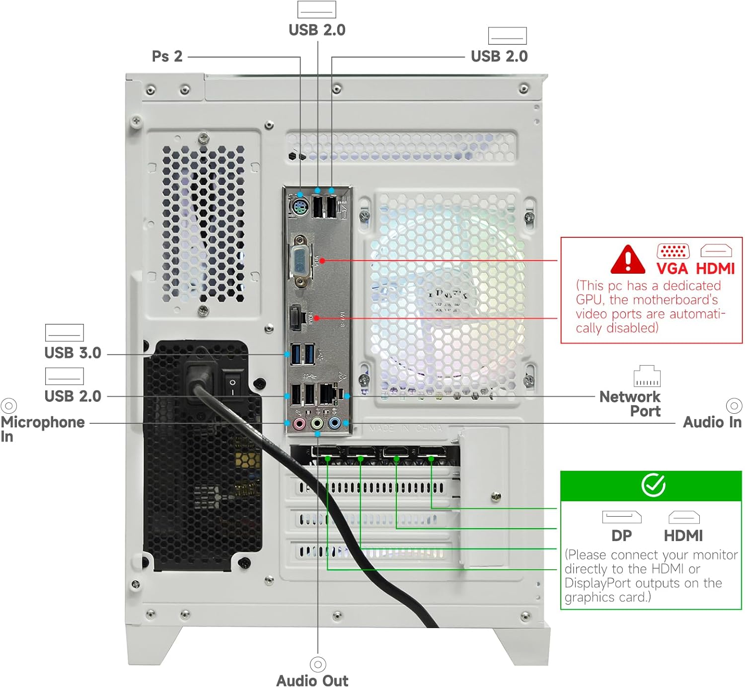 This computer has a dedicated graphics card. The HDMI and DP connectors on the motherboard cannot output video signals. For best performance, connect your monitor directly to the HDMI or DisplayPort outputs on the graphics card.