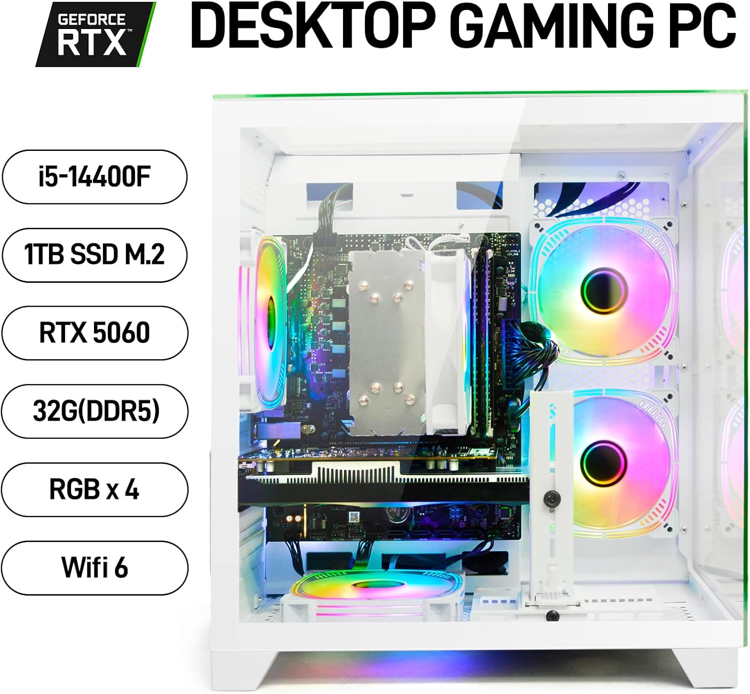 Specification: LXZ Gaming PC Desktop Computer, Core i5-14400F, GeForce RTX 5060 8GB, 32GB DDR5 RAM, 1TB SSD, WiFi 6, 650W PSU, Black Tower Prebuilt PC