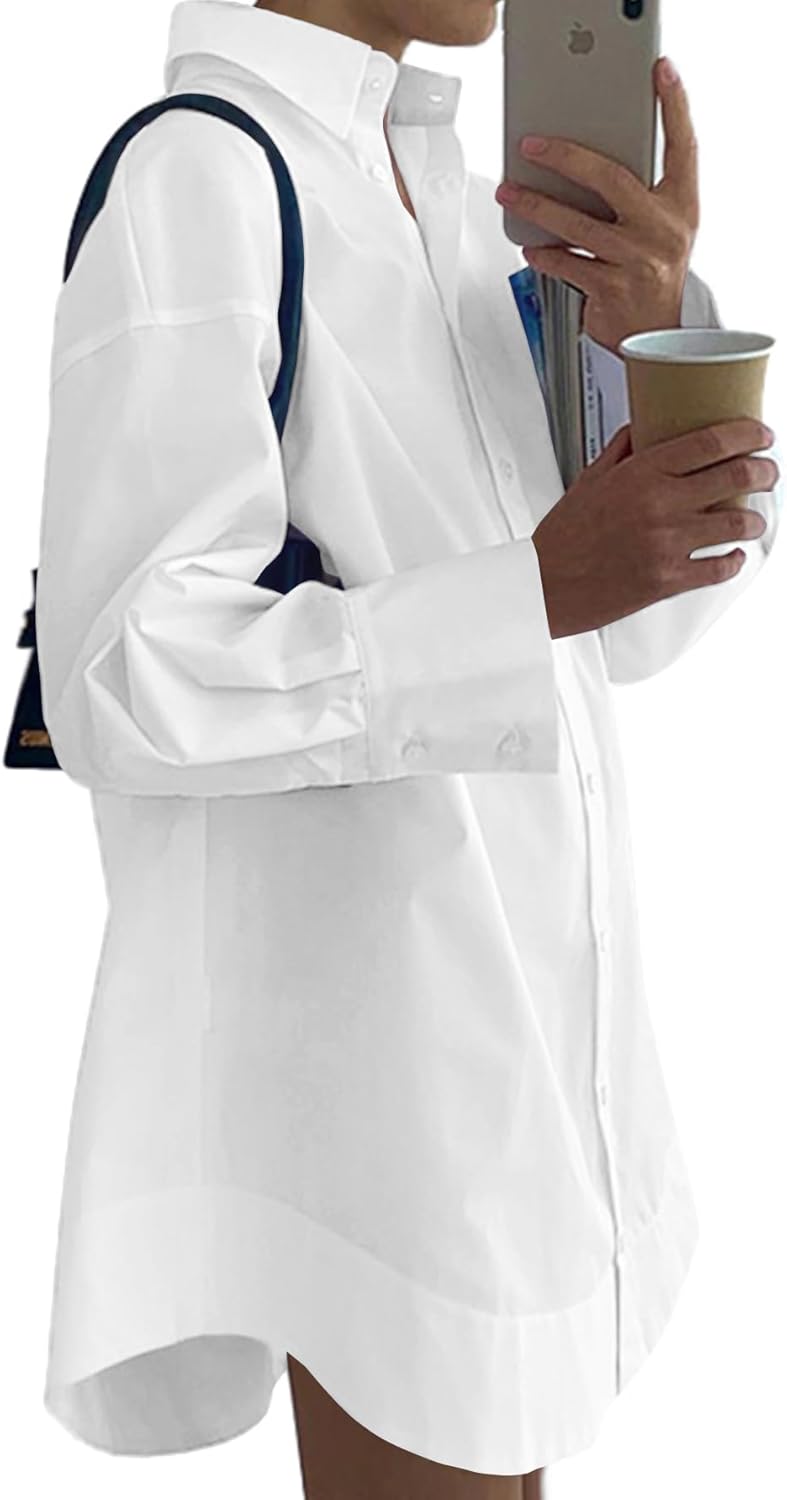 LYANER Women’s Casual Shirt Dress Collar V Neck Button Down Loose Long Sleeve Mini Dresses