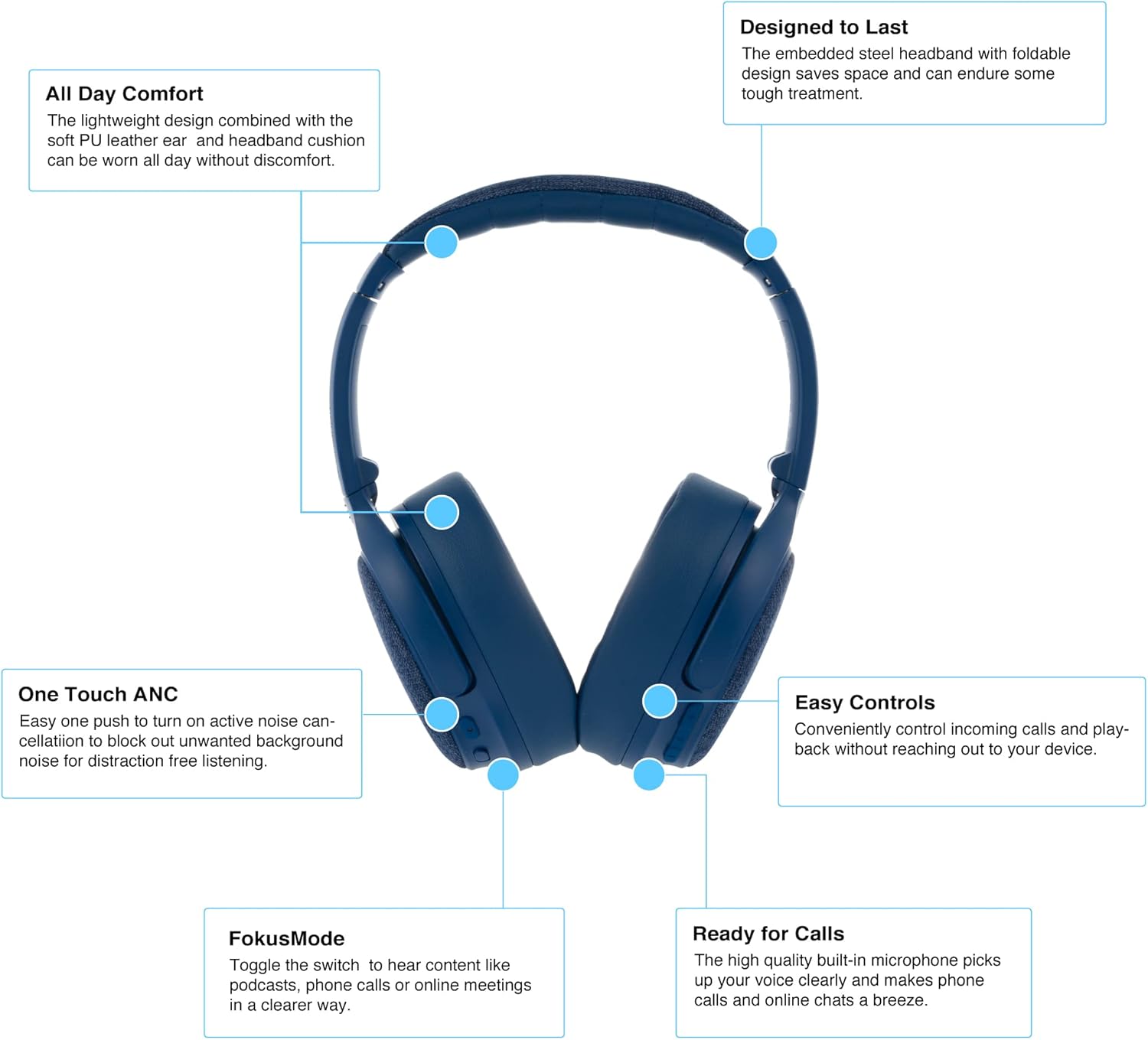 Made for Amazon, Active Noise Cancelling Bluetooth Headphones with Built-in Microphone | Blue