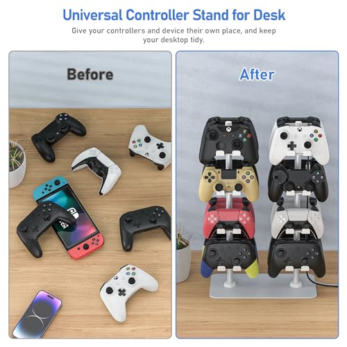 🎮︎【Universal Controller Stand for Desk】The game controller works with almost all versions of controllers and is compatible with all kinds of retro and wired controllers, Such as: PlayStation PS5/PS4/PS3/PS2, Xbox One, the Xbox Series X/S/Elite, etc. In addition you can also store other devices, similar to mobile phone, headphone, game console and so on. Give your controllers and video game accessories their own place, and keep your desktop tidy.