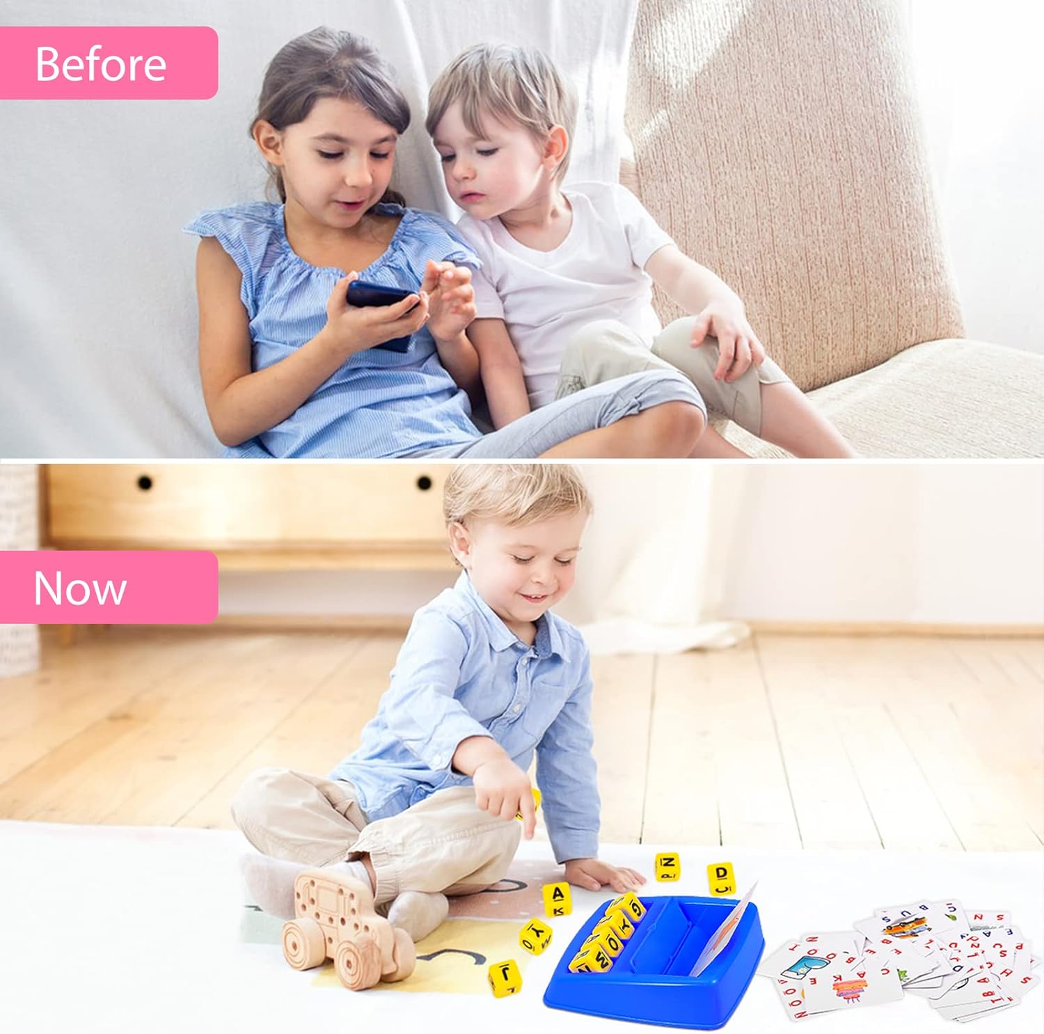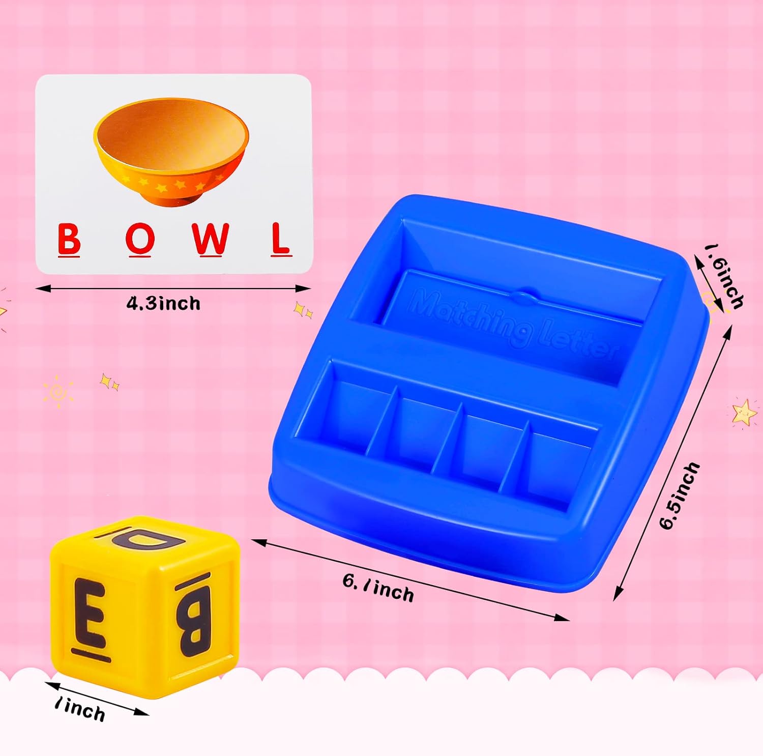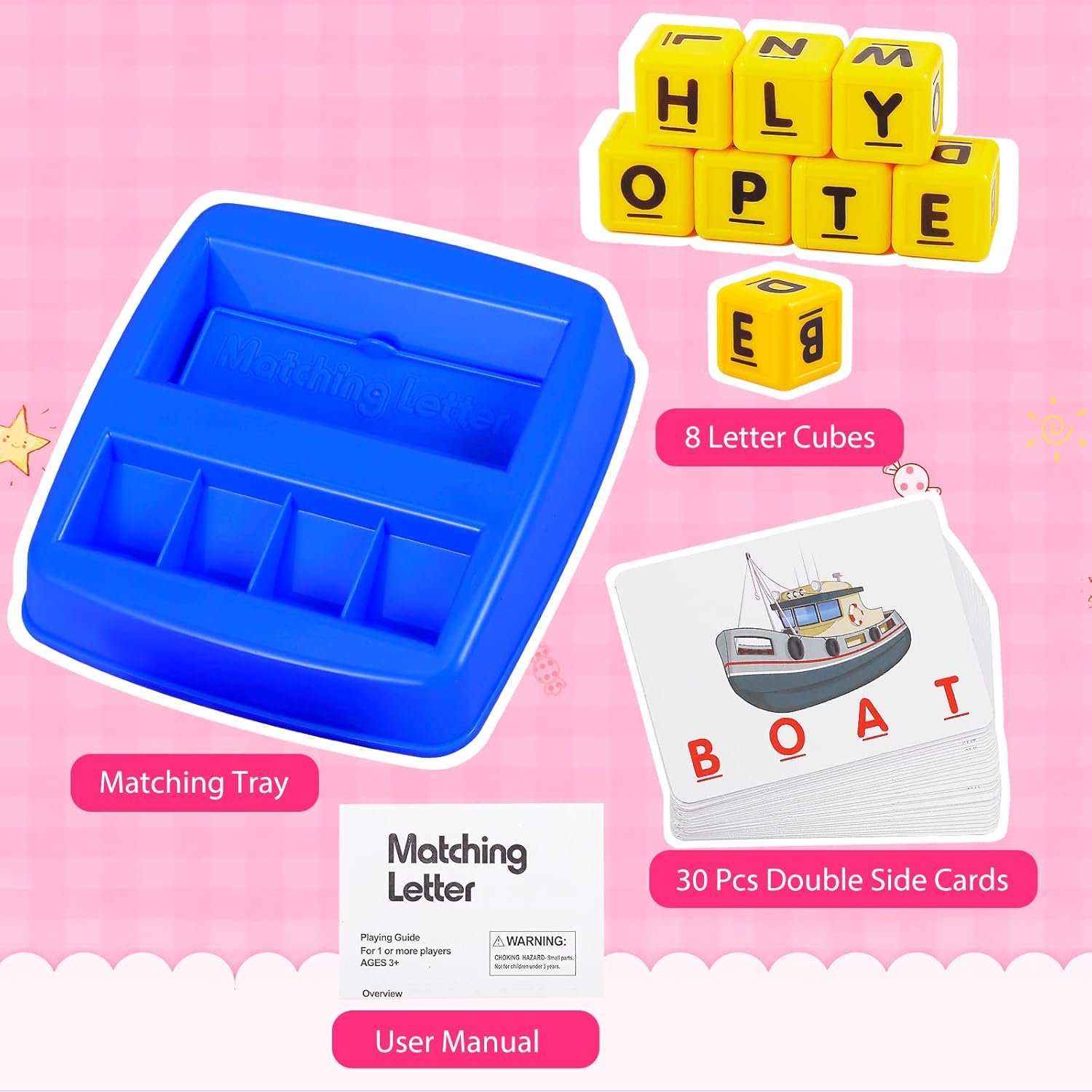 Package Included: The matching letter game comes with 1 tray, 8 letter cubes, 30 cards(60 word cards with 3 and 4 letter words).
