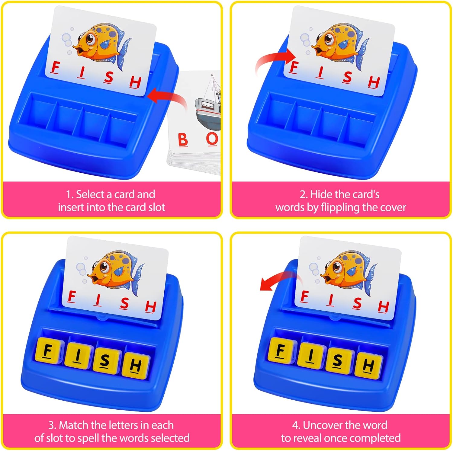 Family fun & multiple benefits: the matching letter spelling game not only does activity teach spelling and memorization, but also helps children advance hand and eye coordination. The spelling game is designed for 2 or more players, great for parents and children to play together.