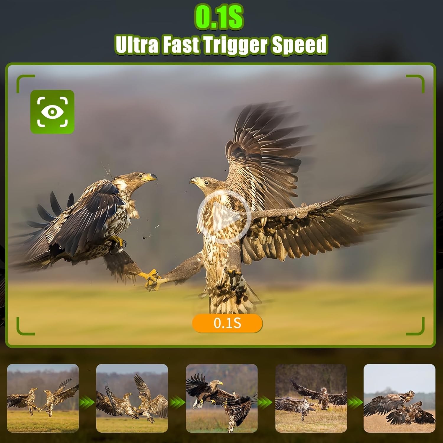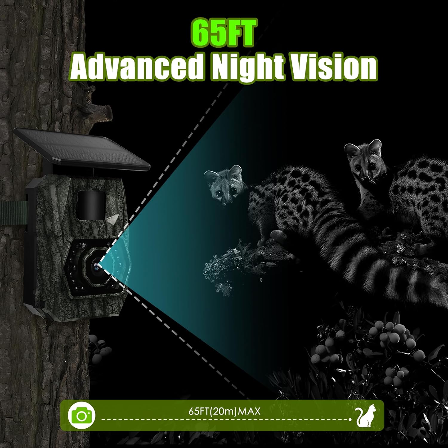 Fast 0.1s Trigger Speed: Our solar trail camera features an ultra-fast 0.1s trigger speed with 1 to 5 shots choice guarantees fast and accurate capture of each detected motion, helping you document the natural behavior and habits of wildlife. 100° detection range gives you an expansive field view, coupled with an impressive 65ft trigger distance, this trail cam guarantees swift and accurate detection of movement from afar, allowing you to monitor wildlife without disturbing their natural behavior.