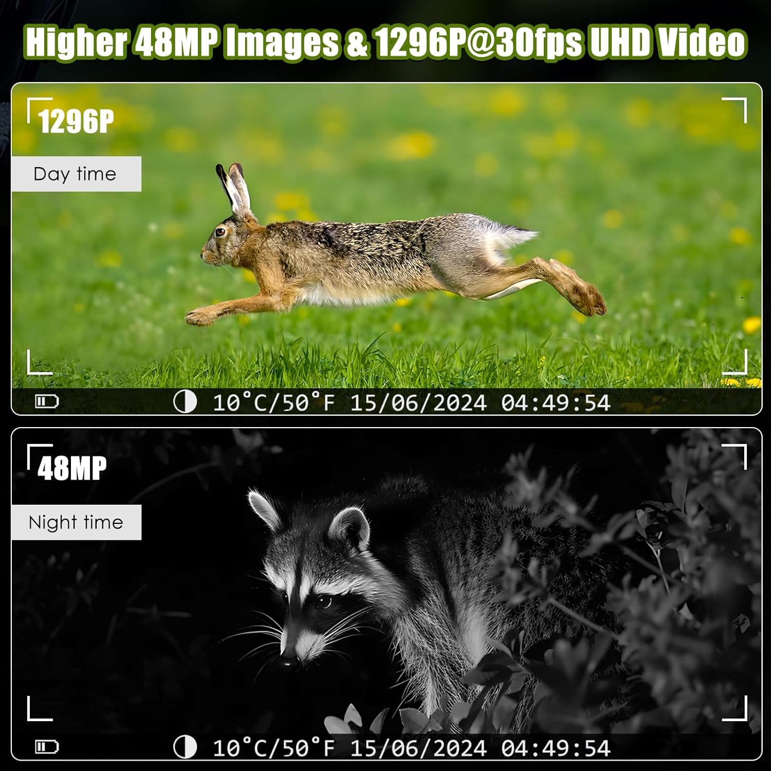 HD H.264 Video & Enhanced 48MP Image: Capture every detail in stunning clarity with our trail camera boasting an impressive 1296P@30fps resolution and 48MP high-definition image quality. Elevate your outdoor experience with unrivaled precision and vividness. Featuring H.264 technology, offers efficient compression, allowing for high-quality video storage while minimizing file size.