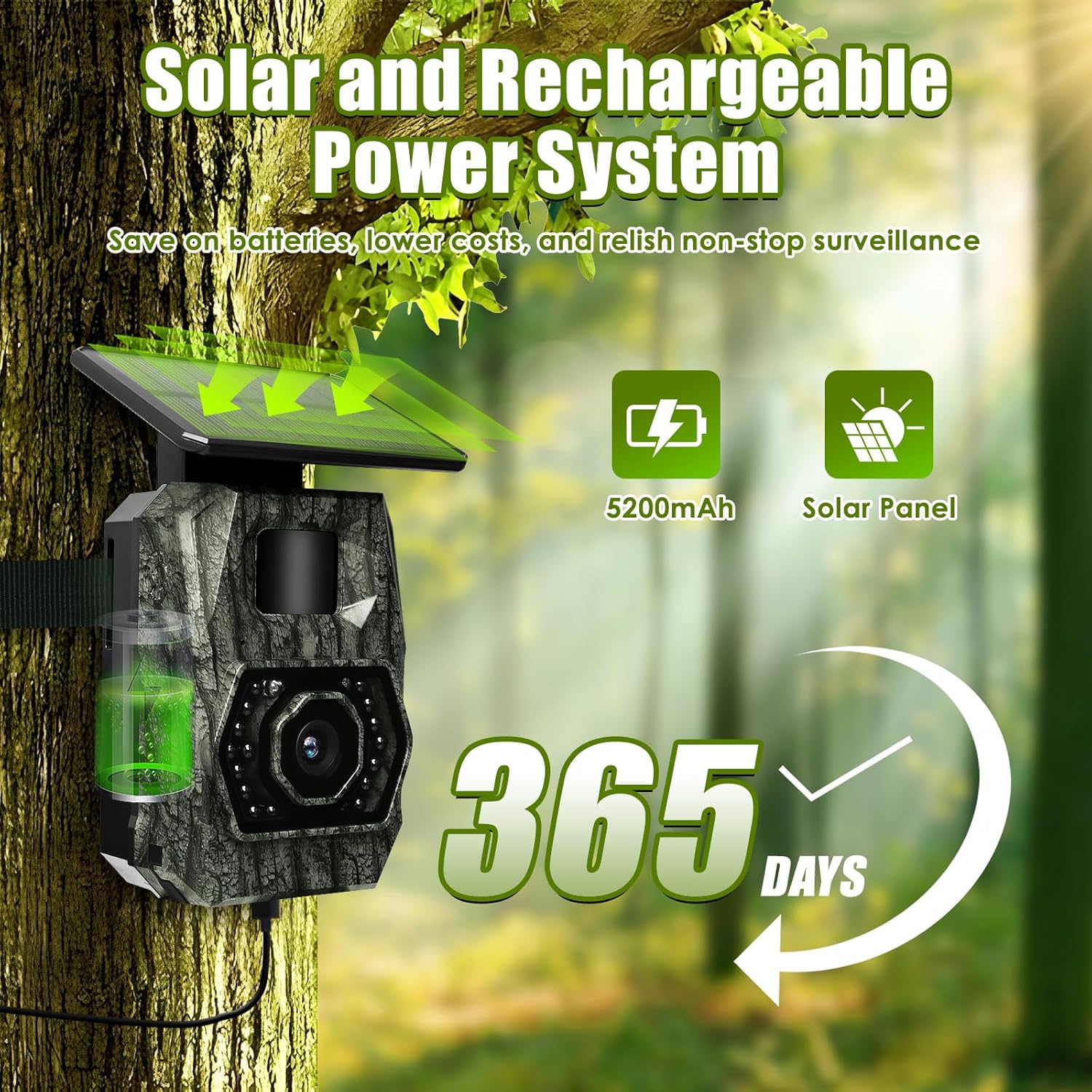 Solar Powered & Rechargeable Trail Camera: This WiFi trail camera equipped with an integrated solar panel for self-sustaining power. The built-in high-capacity 5200mAh battery can be charged directly with a Type-C cable. Extra long standby time ensures continuous operation and sustainability, ideal for extended surveillance and monitoring in outdoor and remote areas. A must-have for hunting essentials.