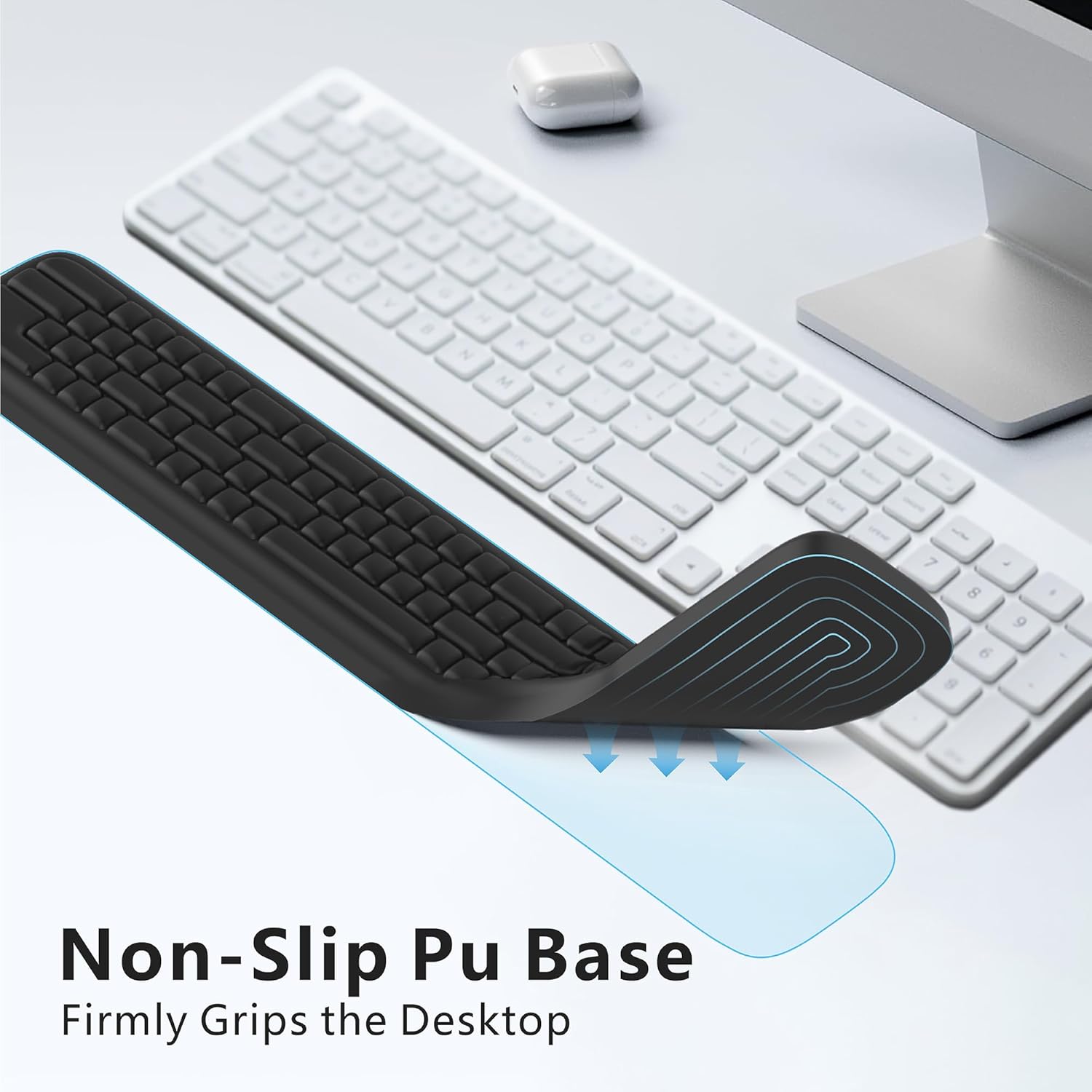Non-Slip PU Base for Secure Stability: The PU bottom ensures the wrist pad for keyboard stays firmly in place, even during fast typing or intense gaming. Its slightly sticky design prevents it from sliding on the table surface and leaves no residue or sticky feeling.