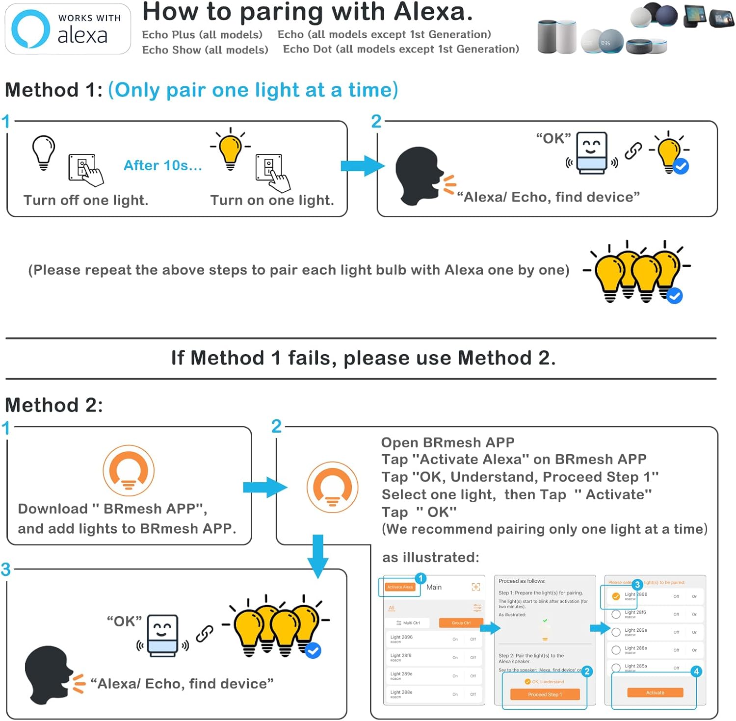 【Works with Alexa and BRmesh APP】These Alexa led light bulbs compatible with all Alexa speakers, easy to operate, no need WIFI, no need to connect to a router, no need for a gateway. BRmesh APP provides many features that are popular with consumers but not available on Alexa, such as color temperature fine-tuning, Scenes, and more. (Note: Uninstalling BRmesh APP after adding the lights to Alexa will not affect the use of these lights with Alexa).