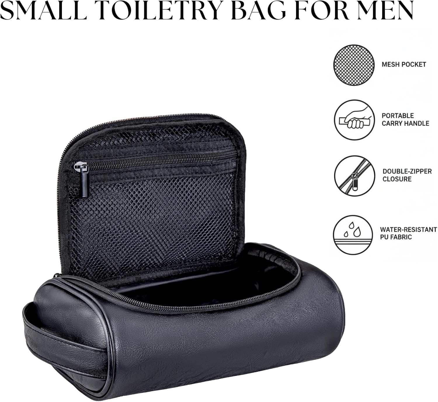 Mens Slim Toiletry Bag, Minimalist PU Leather Dopp Kit for Men, Compact Shaving Kit Organizer, Small Water-Resistant Travel Bag for Grooming Essentials Only,Black