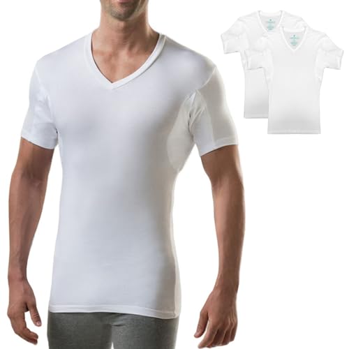 Men’s Sweatproof Undershirt – Slim Fit V Neck T-Shirt with Underarm Sweat Pads, 2-Pack – Aluminum-Free Alternative, White, Large