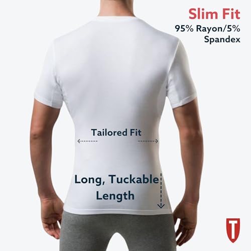 Versatile Sweat & Odor Defense T-Shirt: Our stylish men’s v-neck undershirt complements any outfit while discreetly keeping sweat and body odor at bay, giving you the confidence to wear any shirt without fear of sweat marks; These slim fit undershirts are made from 95% premium rayon and 5% spandex exclusive of the underarm pads inner layer and feature a tagless, lay-flat collar for a seamless, smooth fit