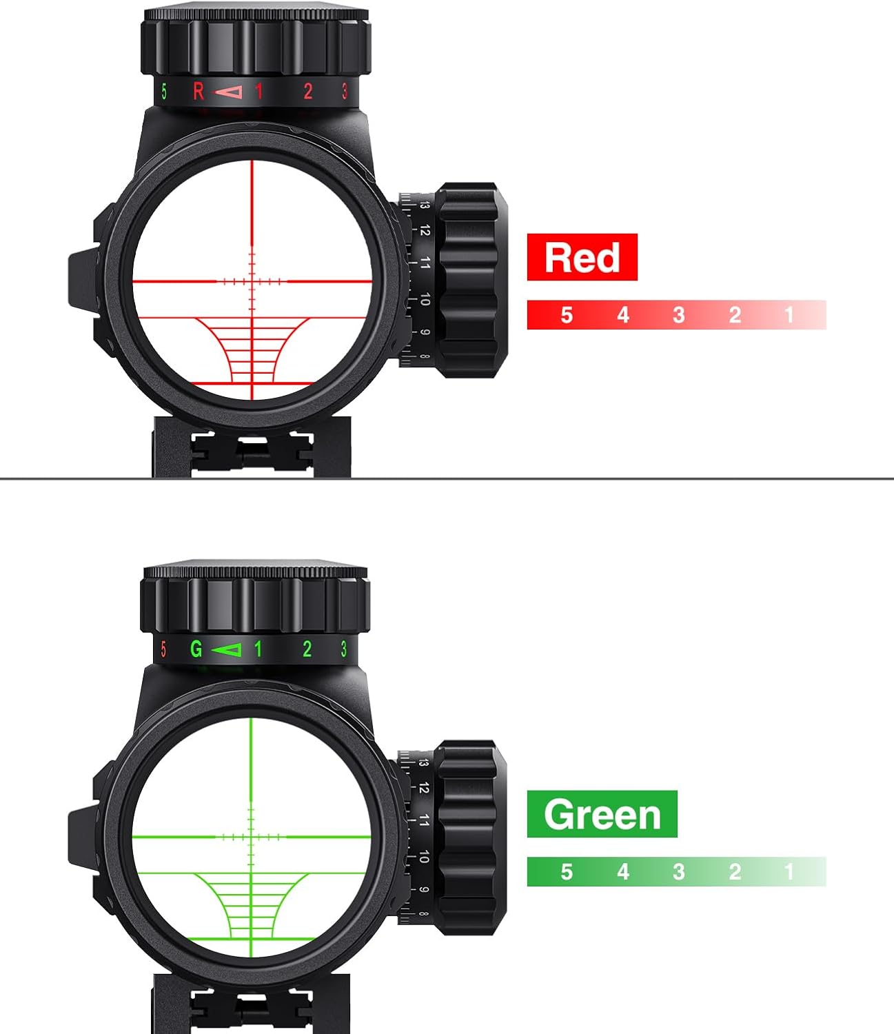 Two Color Illuminated Reticles of The Scope: Red and Green, each of which has 5 brightness level Range Finding reticle, and 4 different sizes of red/green dot sight, all of which help to promote accuracy