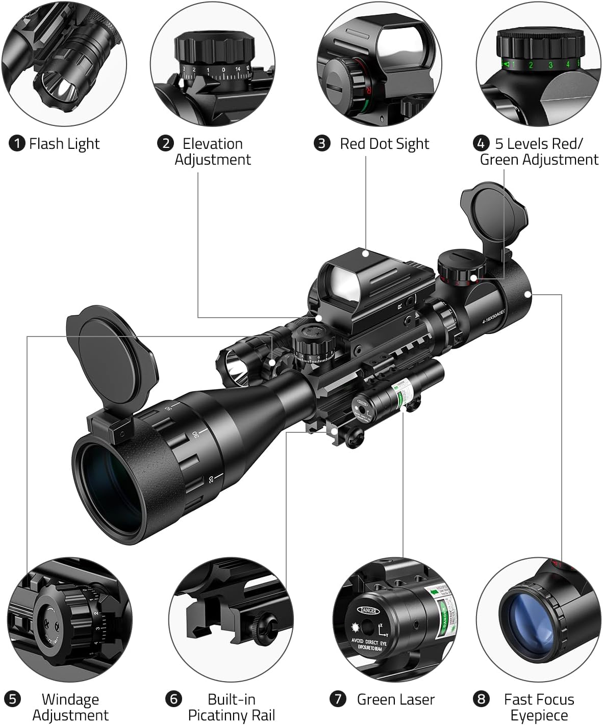 Upgraded 4 in 1 Scope Combo: Comes with an AO riflescope, a green laser sight, a red dot sight, and a flashlight. Having a flashlight with 5 brightness modes provides acquiring target quickly for low-light situations