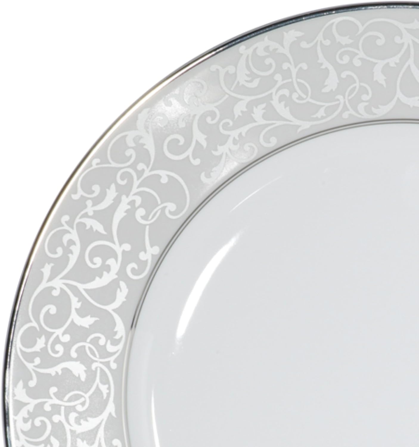 CLASSIC DESIGN: the Parchment dinnerware collection from Mikasa features a gentle gray border embellished with beautifully detailed scroll design.