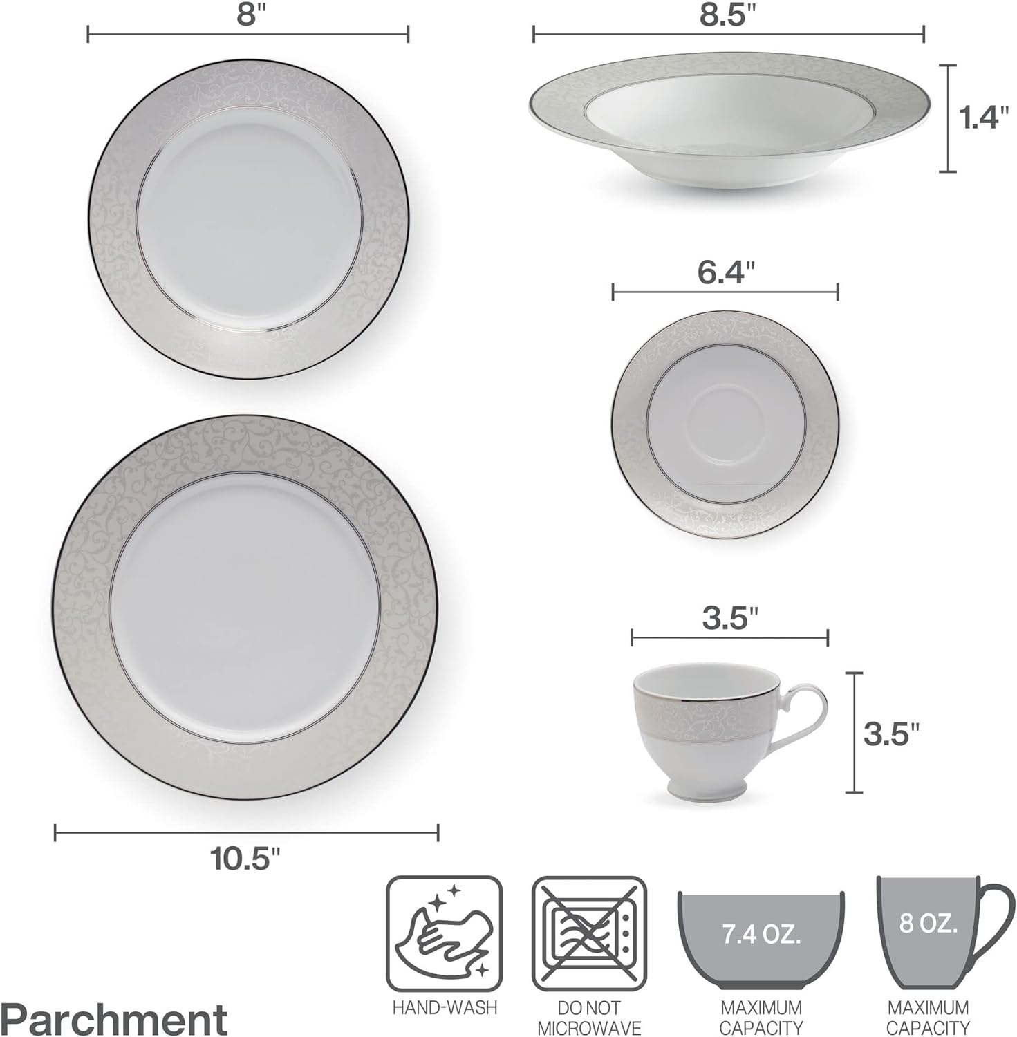 Bring refined elegance to your table with the Mikasa Parchment 40-Piece Dinnerware Set, featuring a delicate scroll design and subtle platinum accents on crisp white porcelain. Designed to serve eight, the set includes dinner plates, salad plates, soup bowls, fruit bowls, and mugs—offering everything needed for formal dinners or everyday meals. The timeless parchment design creates a sophisticated aesthetic that pairs beautifully with both modern and traditional décor. Crafted from durable porcelain, each piece is dishwasher safe for easy cleaning and resistant to chips and cracks. This dinnerware is also microwave safe for reheating (excluding prolonged use due to metallic trim). Perfect for weddings, anniversaries, and dinner parties, the Parchment collection combines beauty with functionality. It’s an ideal choice for anyone seeking an elevated dining experience that stands the test of time in both quality and style.