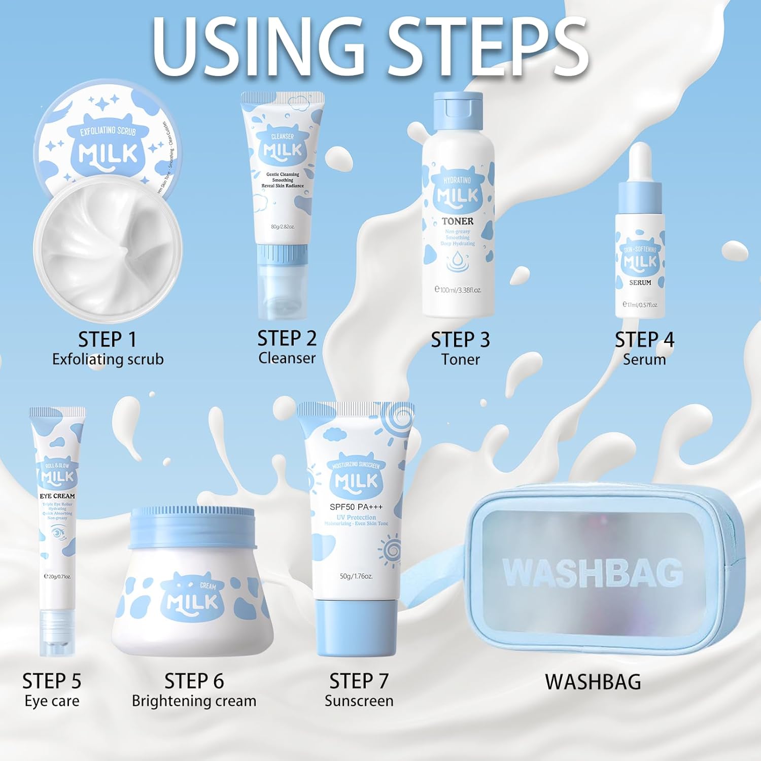 Milk Skincare Set Girls Gifts – 8Pcs Milk Skin Care Sets & Kits for Teens – Skin Care Kit for Women Kids Teenage Girls with Cleanser, Toner, Eye Cream, Serum, Sunscreen, Face Cream, Scrub, Bag