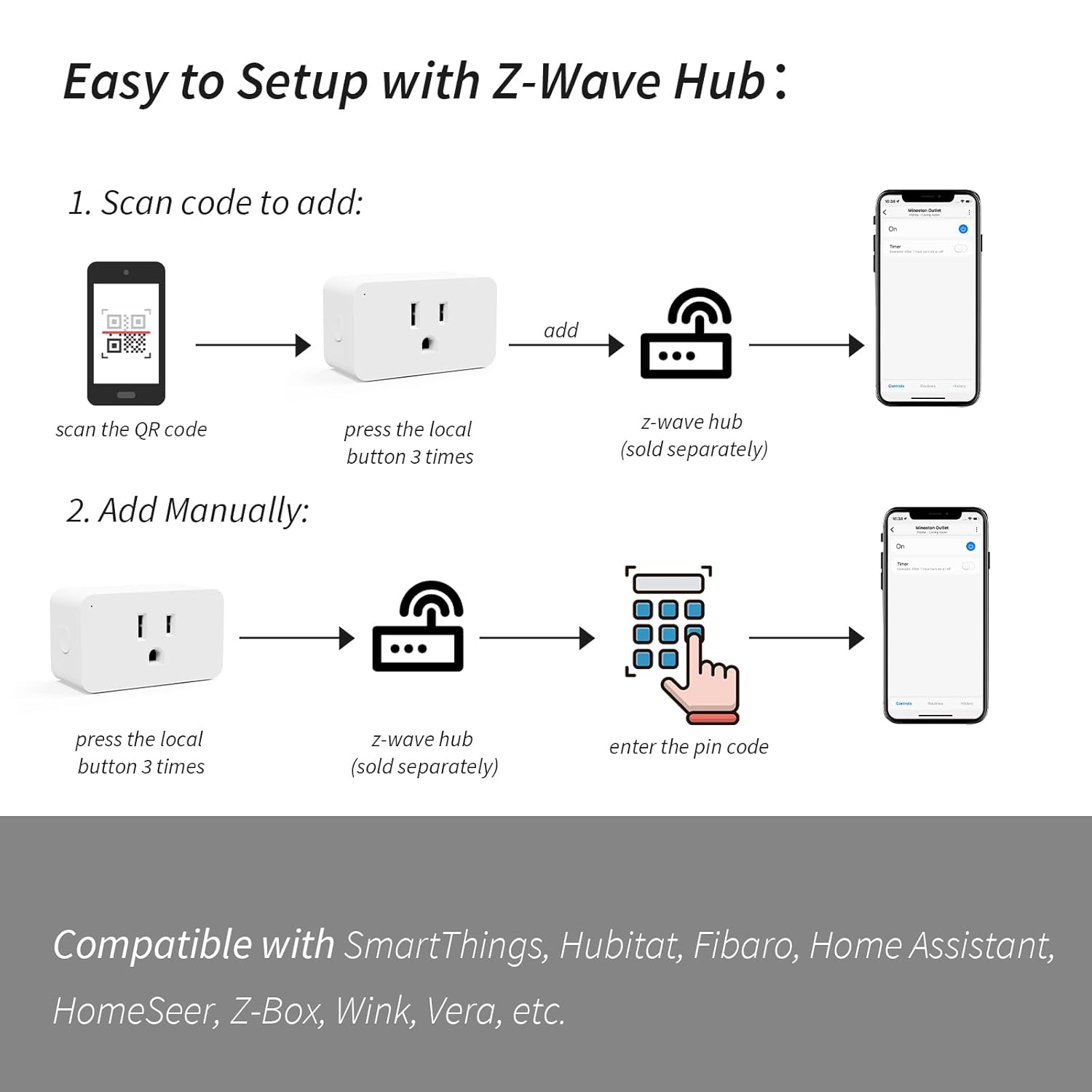[Z-Wave Hub (sold separately) Compatibility] This zwave smart plug requires a z-wave hub (sold separately). It is compatible with SmartThings, Vera, Wink, Fibaro, Homeseer, 2GIG, Hubitat, etc. CANNOT connect directly with ECHO PLUS!Z-Wave Frequency: 908.42MHz.