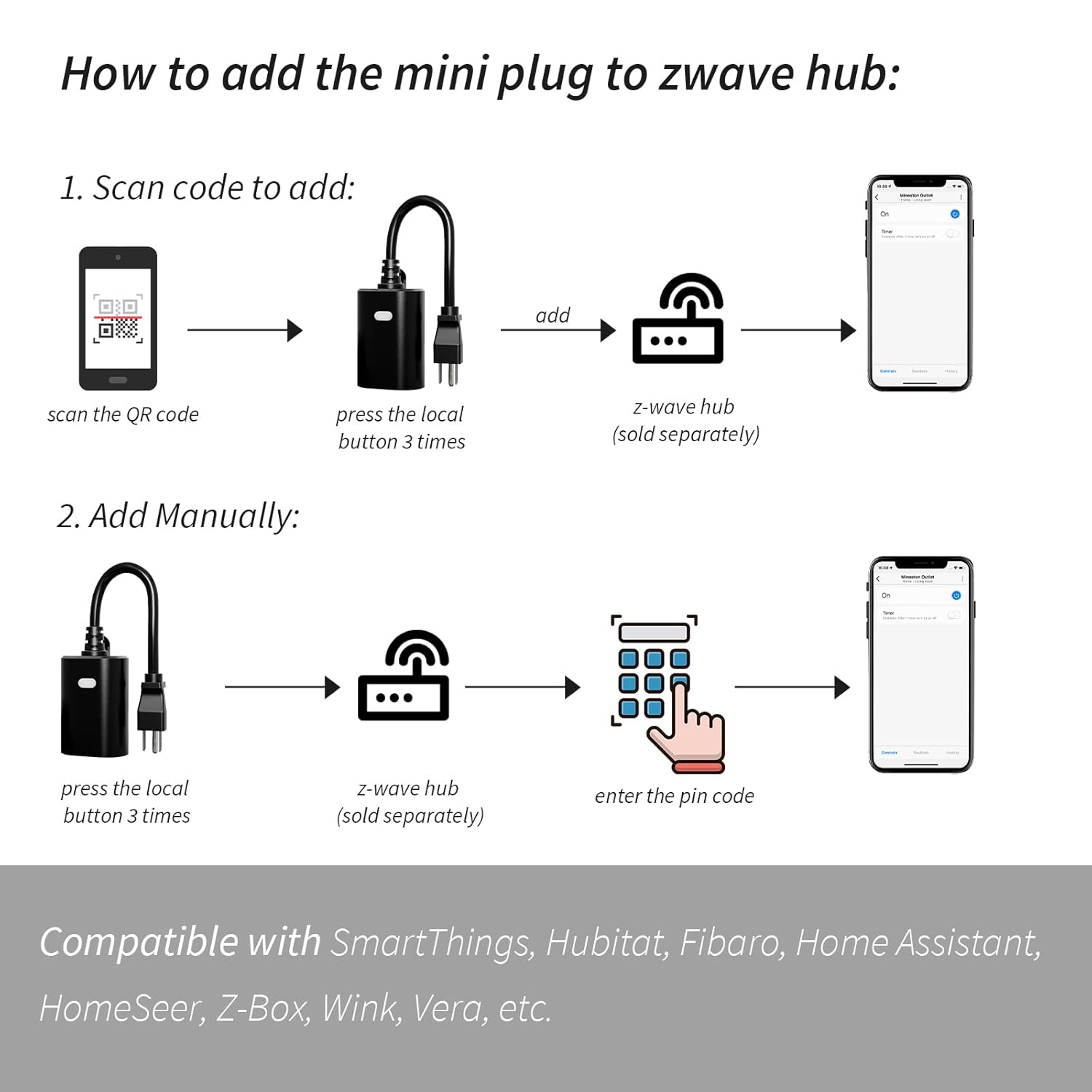 Z-Wave hub Compatibility: This Z-Wave outdoor dimmer plug compatible with SmartThings, Vera, Wink, Fibaro, Homeseer, 2GIG, Hubitat(change device type). COMPATIBLE with ALEXA and GOOGLE ASSISTANT (requires a Z-Wave certified hub). CANNOT connect directly with ECHO PLUS!Z-Wave Frequency: 908.42MHz. FCC and ETL listed