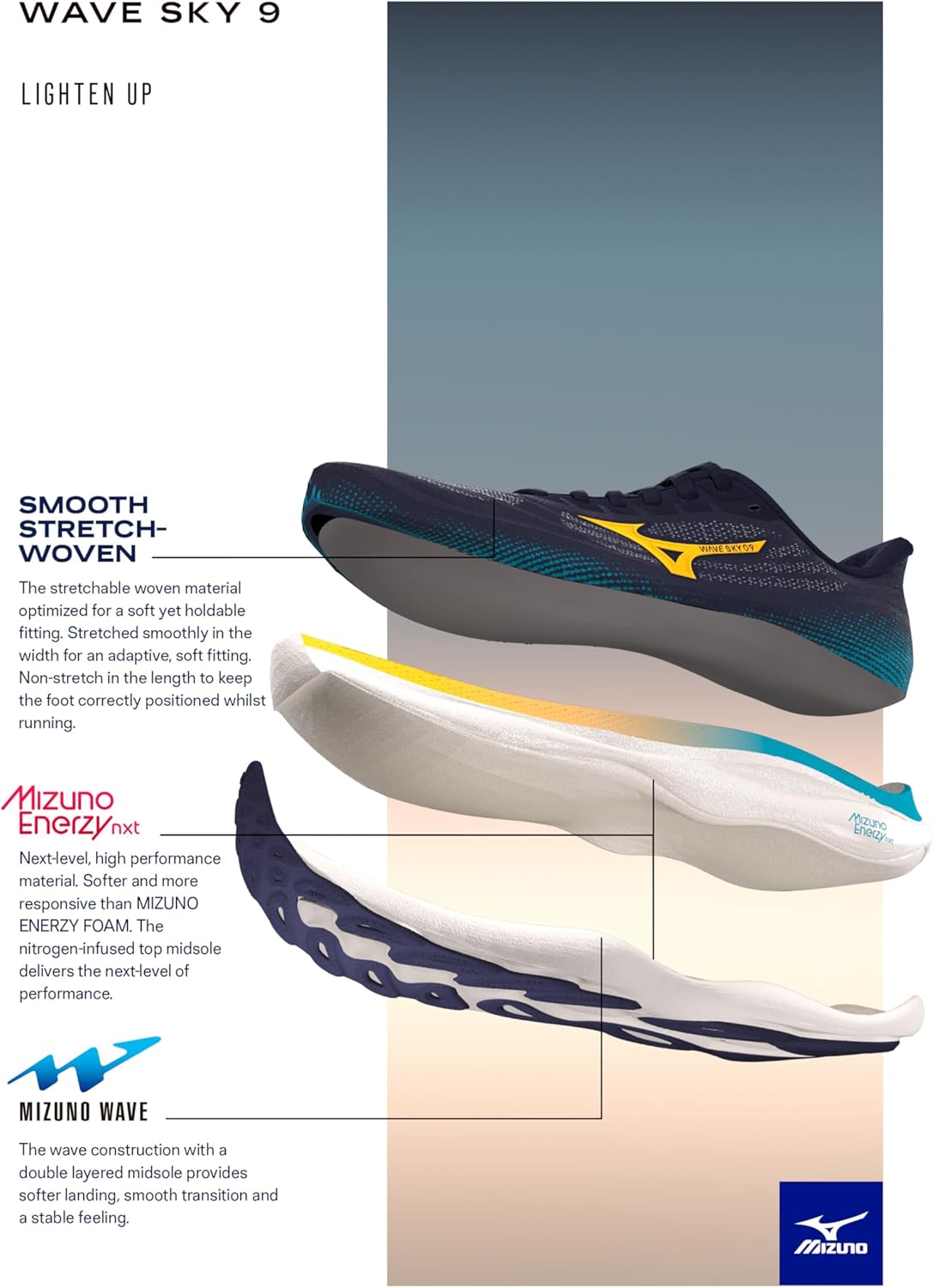 Redefine what it means to float with Wave Sky 9. Crafted to elevate every step with a maximum stack of MIZUNO ENERZY NXT (Nitrogen Infused TPU) formed with MIZUNO FOAM WAVE geometry and a superior upper for an enhanced fit. With updated stack heights and outsole gauges, this max cushion trainer is ready to put your feet in the clouds.
