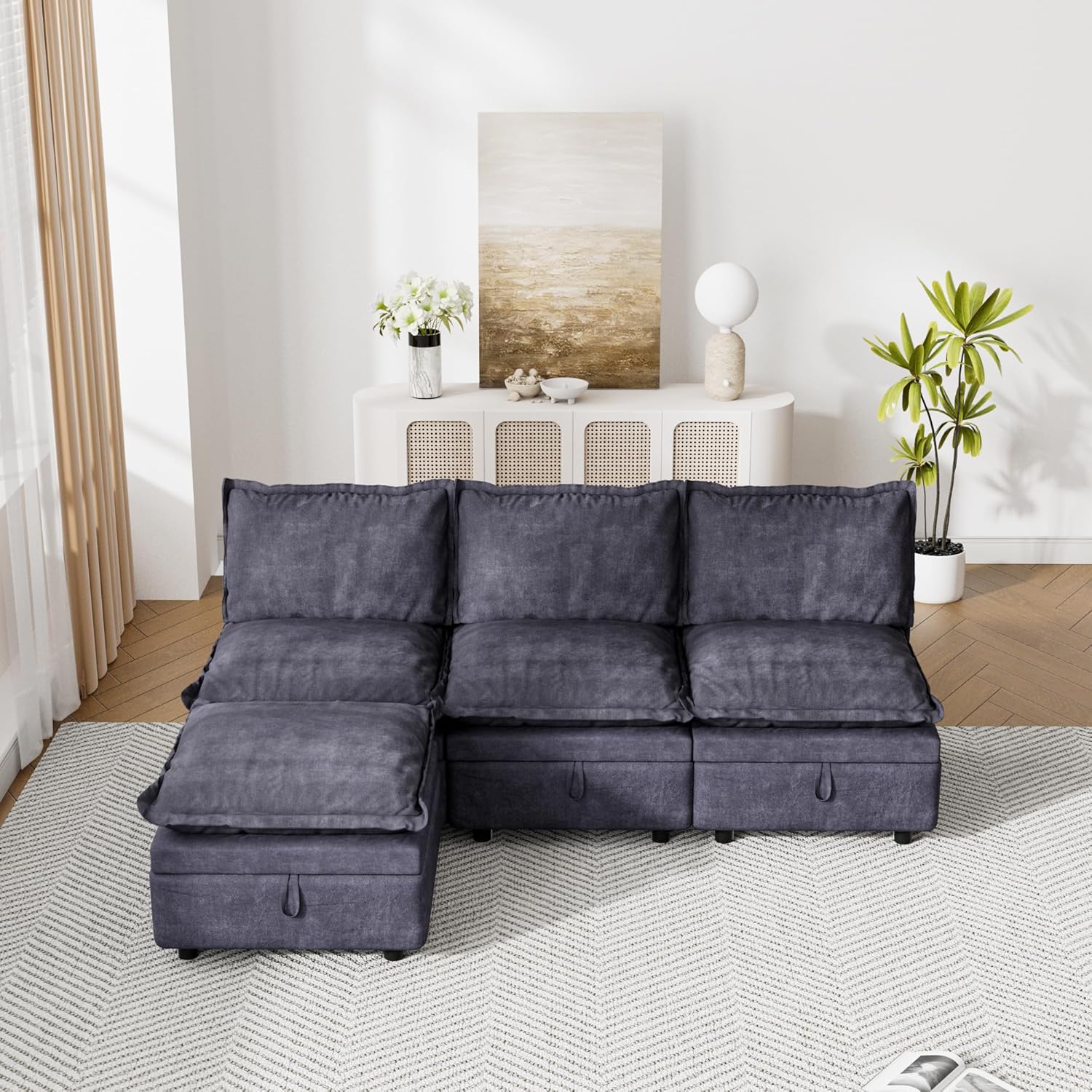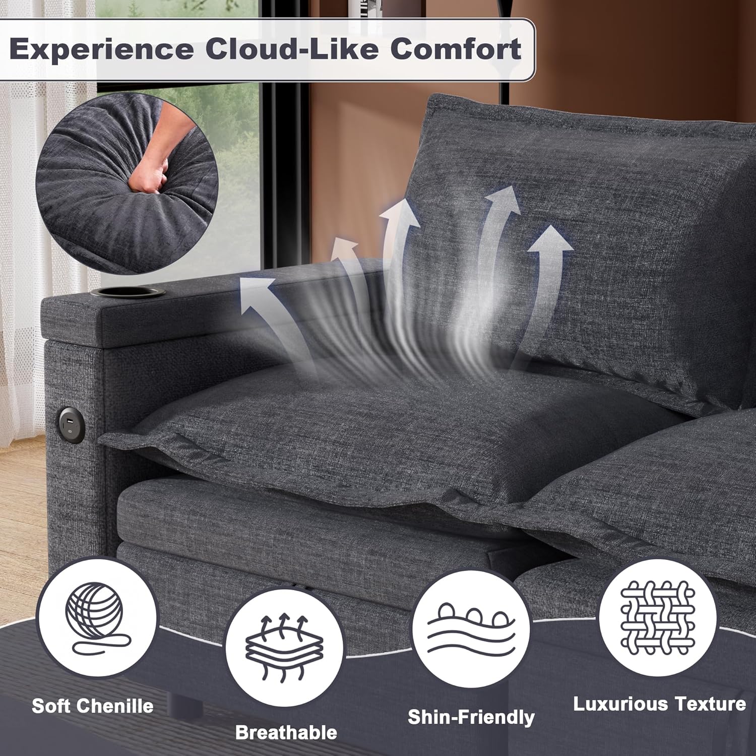 Ultra Comfort & Selected Chenille: Our modular sectional sofa is made of premium chenille fabric for a soft and comfortable feel. High-rebound memory foam provides a cloud-like seating experience. And the ergonomical backrest provides support for your waist and neck, ensuring you’ll have a enjoyable time even after long periods of sitting.