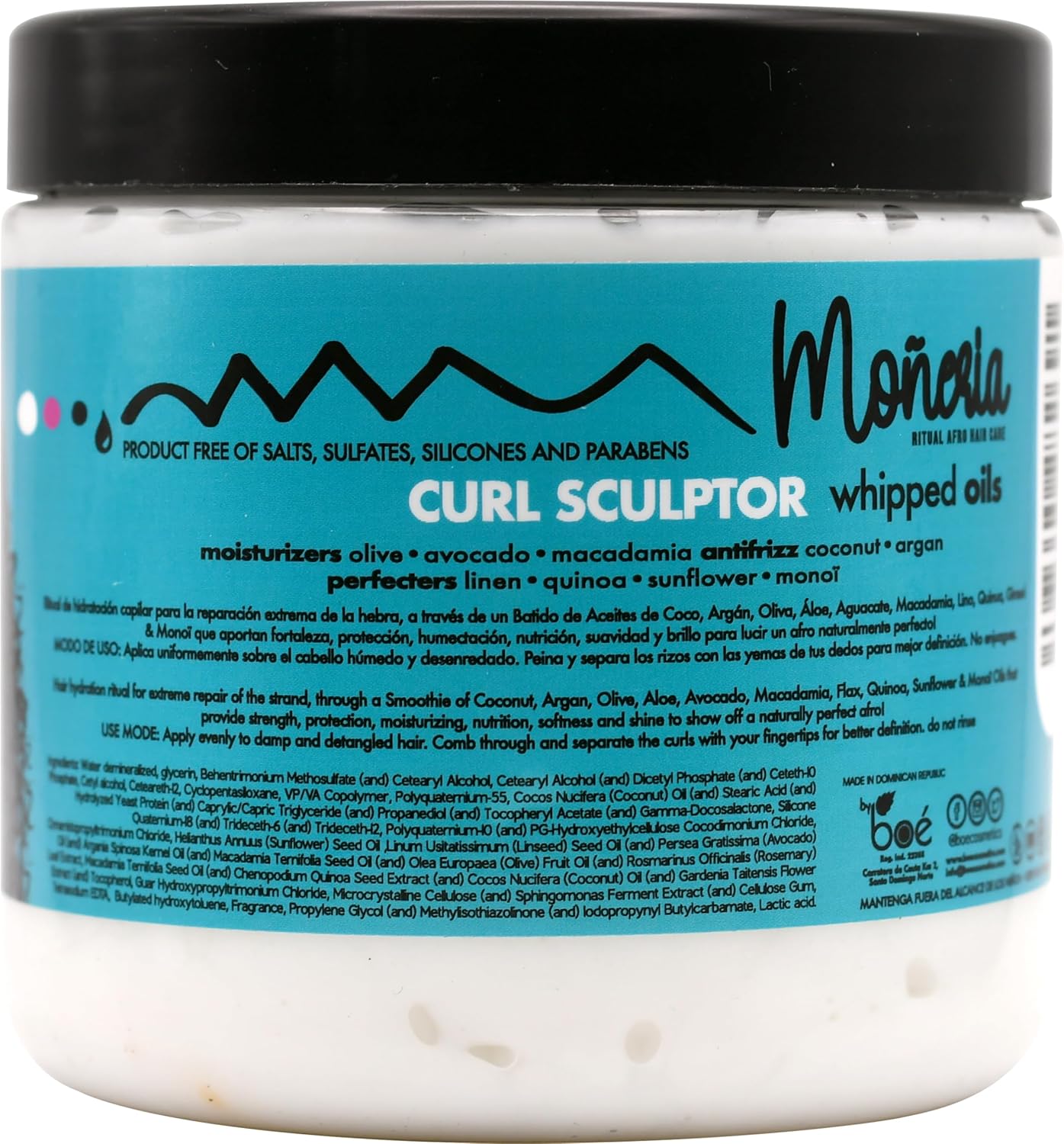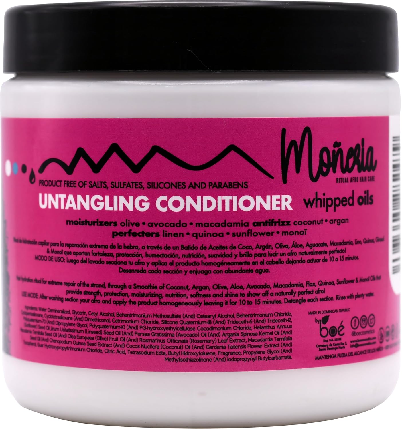 Unleash the power of nature with this Moñeria hair care kit. This comprehensive set includes a detangling conditioner, a curl-defining cream, a hydrating shampoo, and a nourishing hair oil to revive and rejuvenate your locks. Infused with natural ingredients, these products work in harmony to restore moisture, enhance shine, and tame frizz. The detangling conditioner gently unravels knots and tangles, leaving your hair silky smooth. The curl-defining cream embraces and defines your natural texture, while the shampoo cleanses and hydrates without stripping away essential oils. Finally, the hair oil deeply nourishes and strengthens each strand from root to tip. Embrace your natural beauty with this complete hair care routine tailored to your unique needs. Indulge in the luxurious experience and let your hair radiate health and vitality.