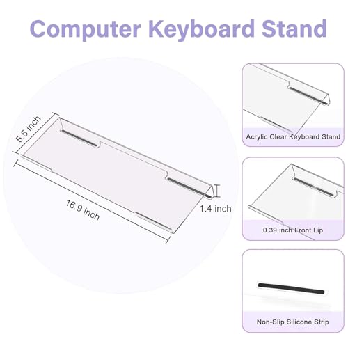This computer keyboard stand is made of clear acrylic, sturdy, strong and smooth. The tilted design elevates the keyboard and holds keyboard at a comfortable angle, preventing it from sliding around. The angled design of the tilting keyboard stand improves hand and wrist posture, releasing pressure on elbows and wrists, making typing easier and more comfortable.