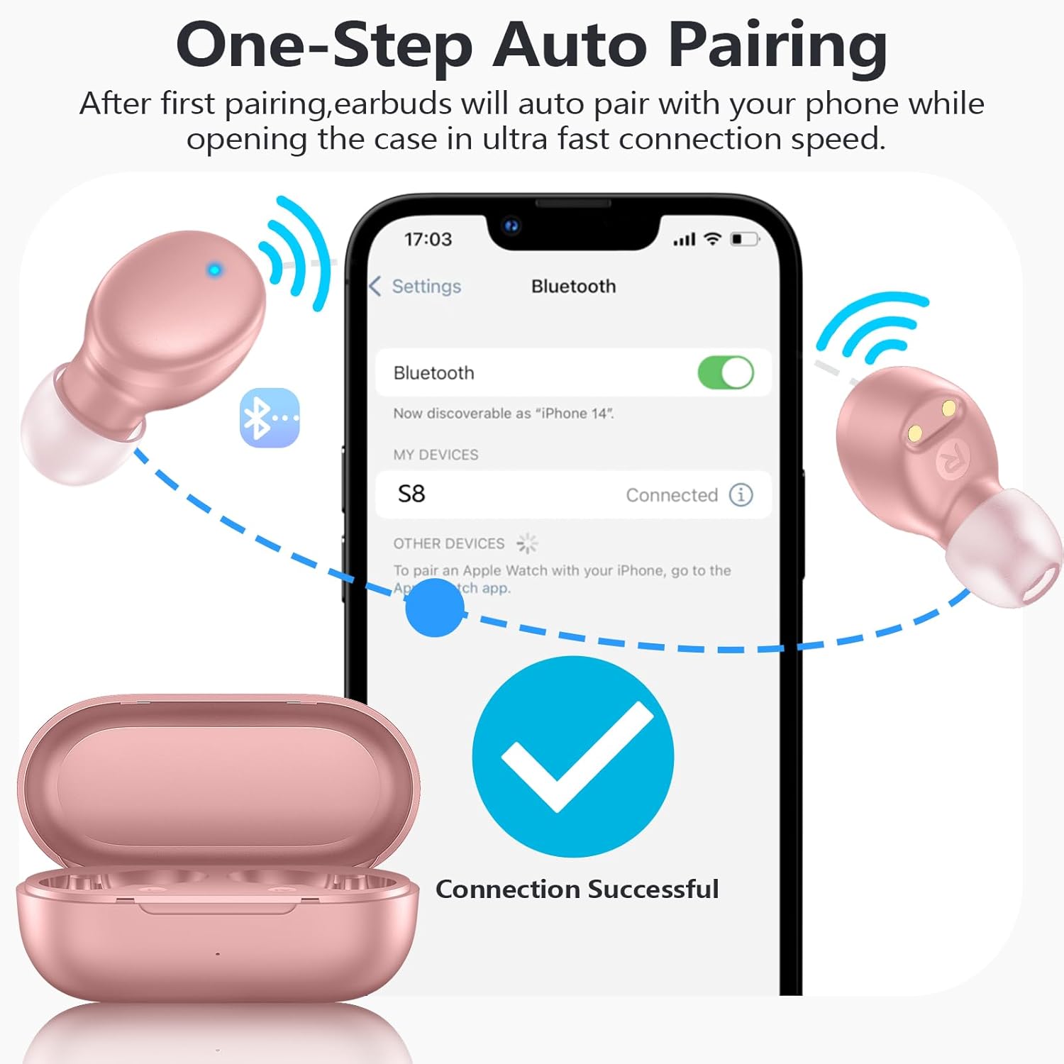 MOZOTER S8 Mini Wireless Earbuds Bluetooth 5.3 in Ear Light-Weight Headphones,60Hrs Playtime Ear Buds with Charging Case,Bluetooth Headsets,Premium Sound with Deep Bass for Sport-Pink