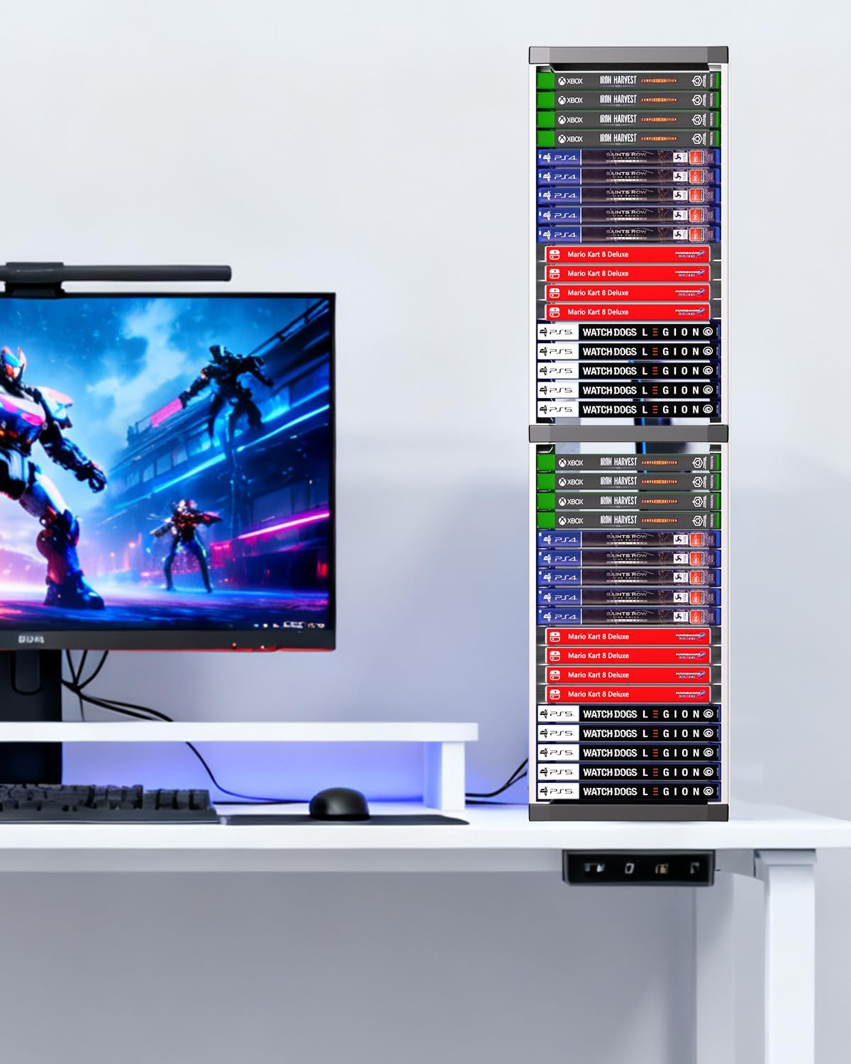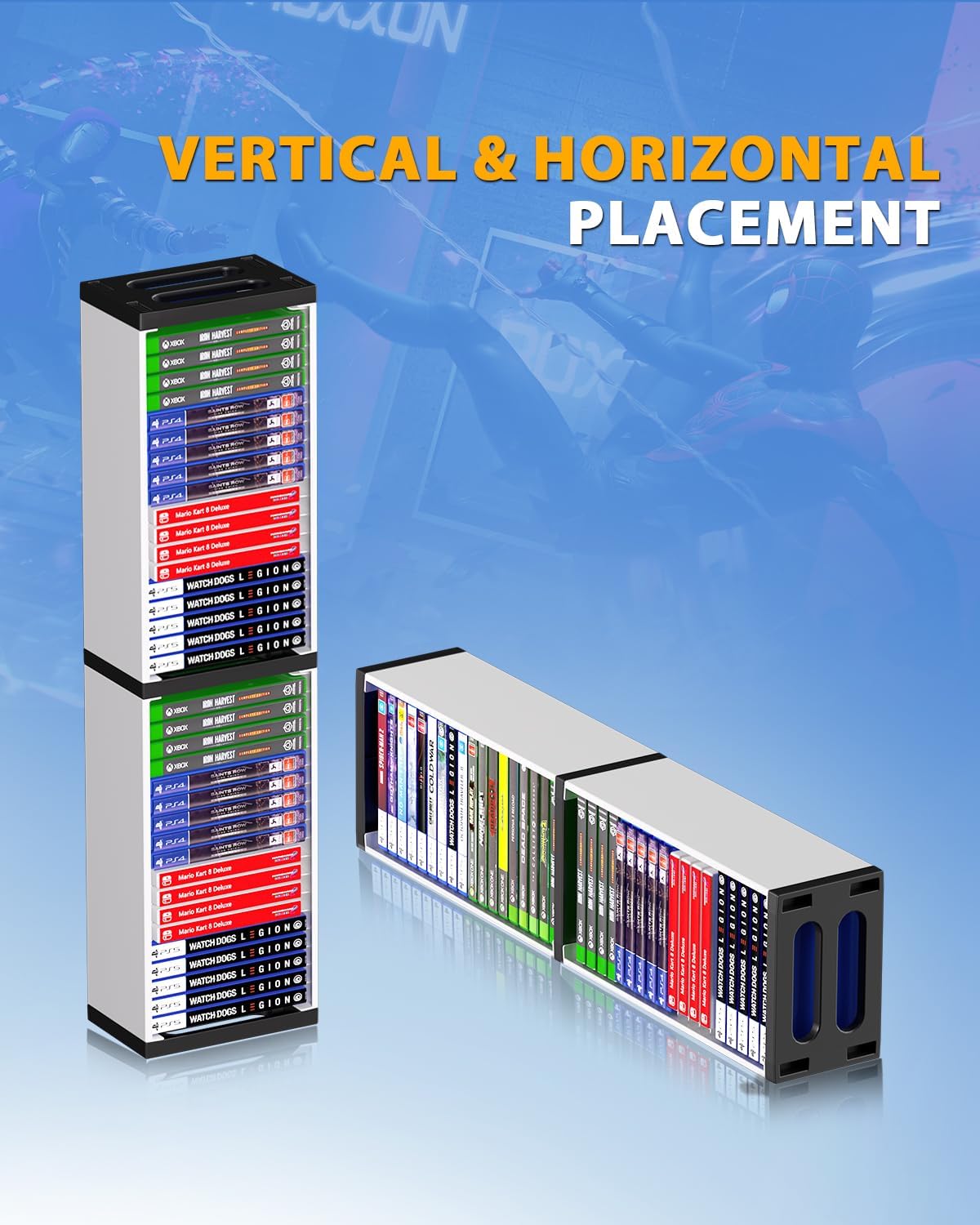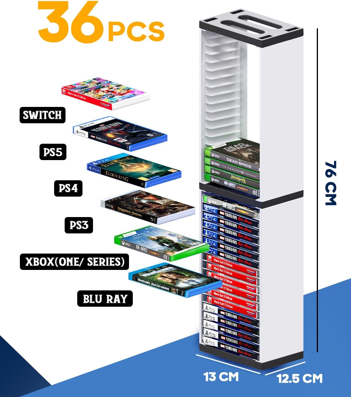 No more messy stacks! This high-capacity stand neatly stores up to 36 PS5/PS4/Xbox Series X/S or Blu-ray casesvertically/horizontally – but please NOTE: FITS PS5, PS4, PS3, Xbox One, Xbox Series X/S and Standard Blu-ray. DOES NOT FIT DVD cases, Xbox 360, PS2, and Slim cases