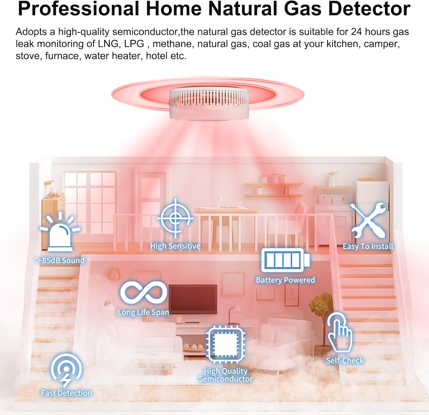 【Whole-Home Gas Security】 Certified for residential & mobile use (kitchens, RVs, basements, garages). 5x faster response than UL standards. Pro Tip: For accurate testing, use enclosed natural gas sample instead of lighters.