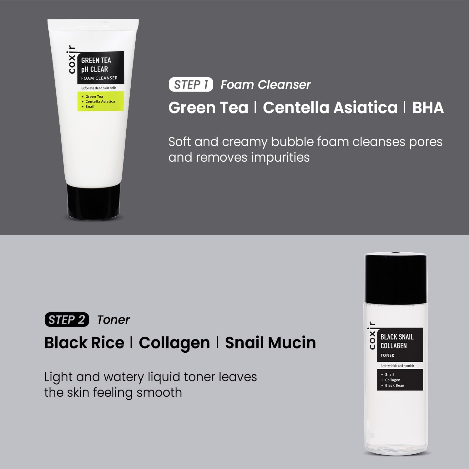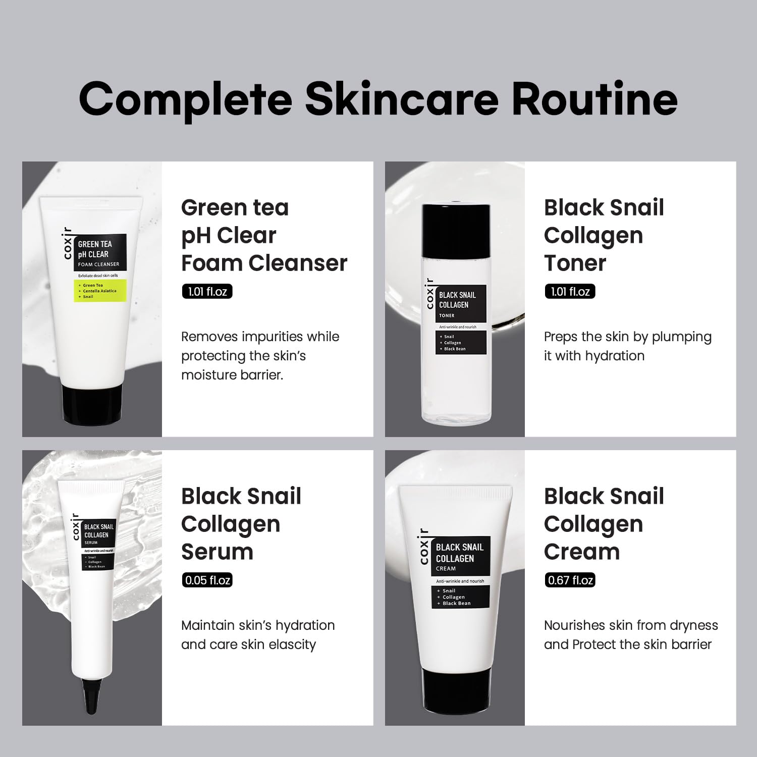 [New Years Gift Set] coxir Black Snail Collagen Starter Kit – Cleanser, Toner, Serum & Cream | Repairing Snail Mucin Skincare Set, Hydrating Korean Beauty Routine for Women (4-Piece)