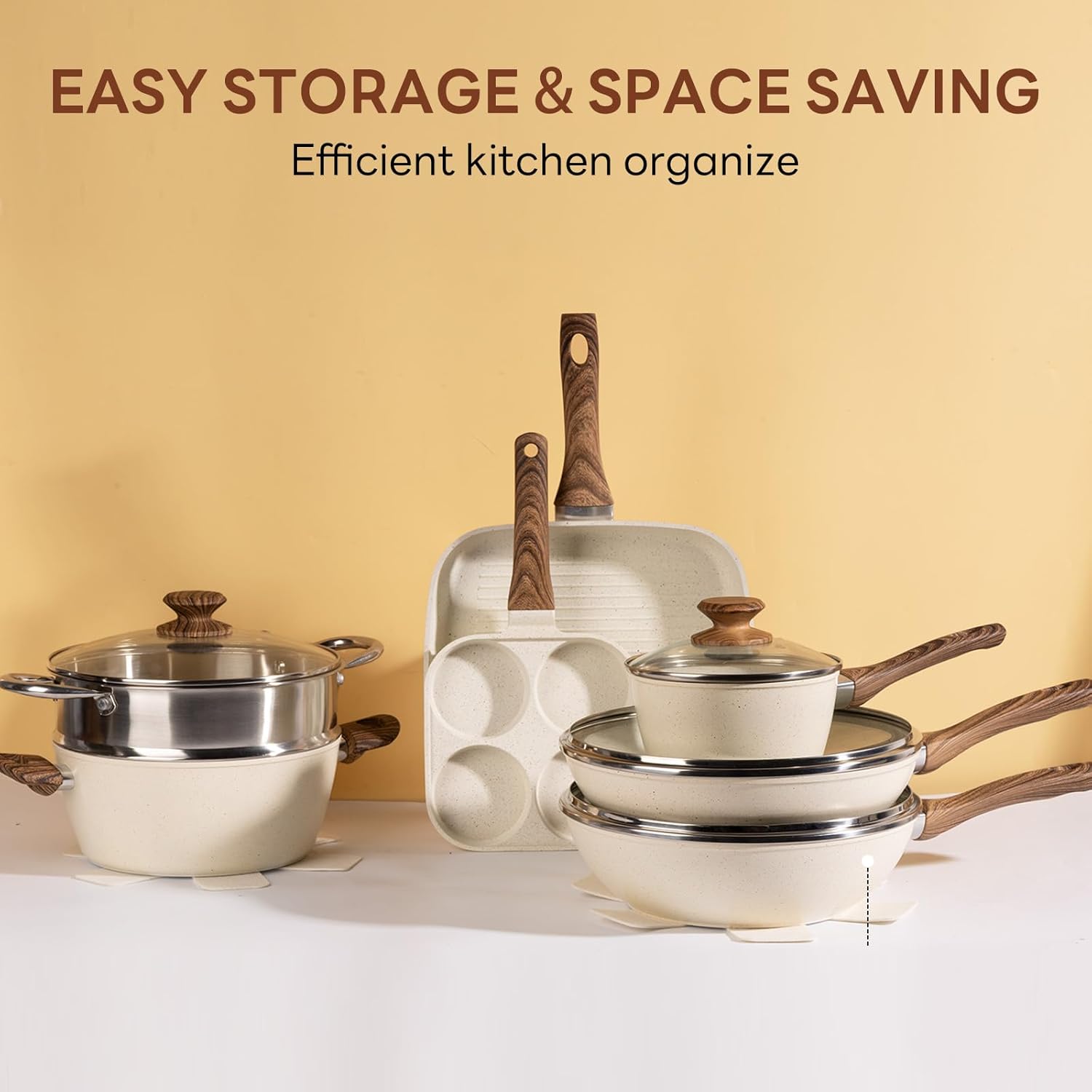 NEWBULIG Cookware Set, Nonstick & Non-Toxic Pots and Pans with Stay-Cool Handles, Induction Compatible, 17-Piece Cream White