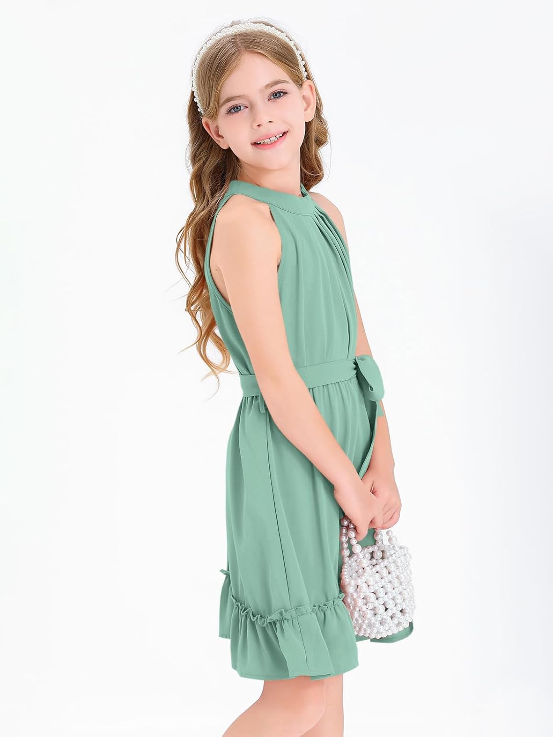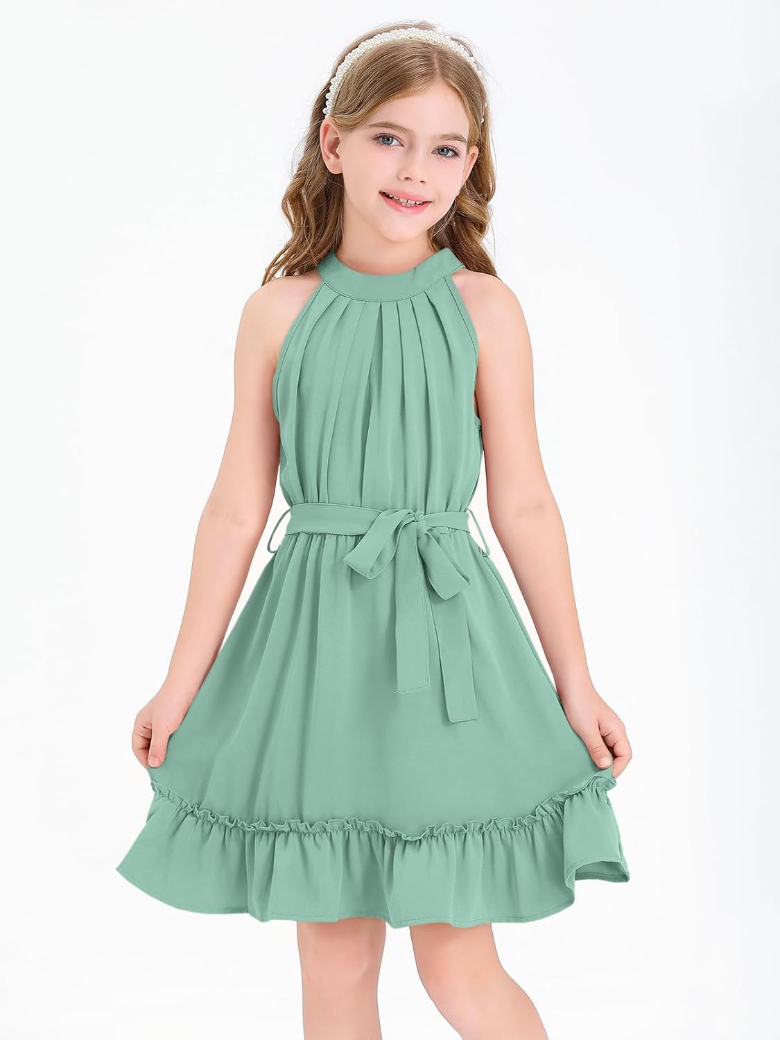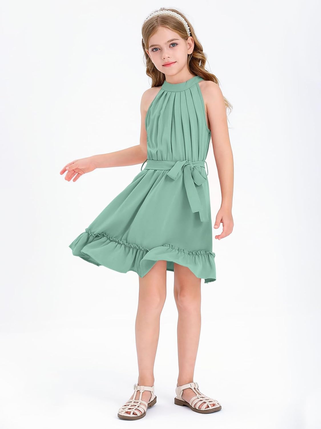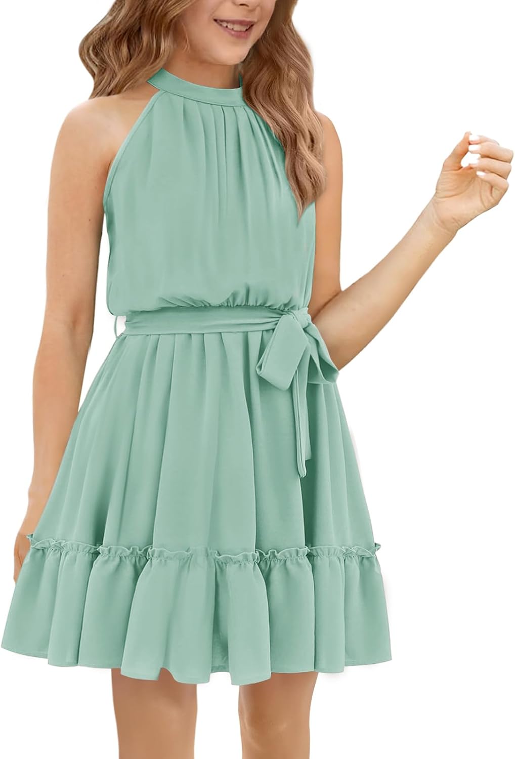 Newffr Girl’s Halter Neck Sleeveless Summer Dress Tie Waist A-line Sundress Mini Swing Pleated Dress for Girls 4-12