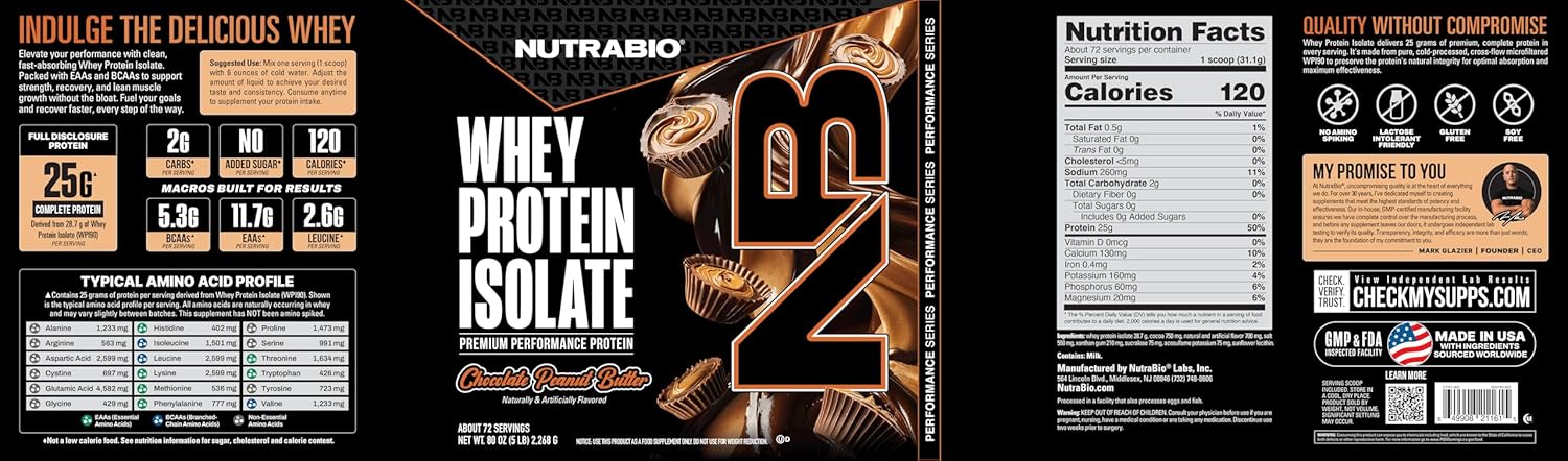 NutraBio 100% Whey Protein Isolate Protein Powder, 25g Protein with Complete Amino Acid Profile, Non-GMO, Soy & Gluten Free, Low Carb, Low Calorie Whey Protein Powder, Chocolate Peanut Butter, 5 Lbs