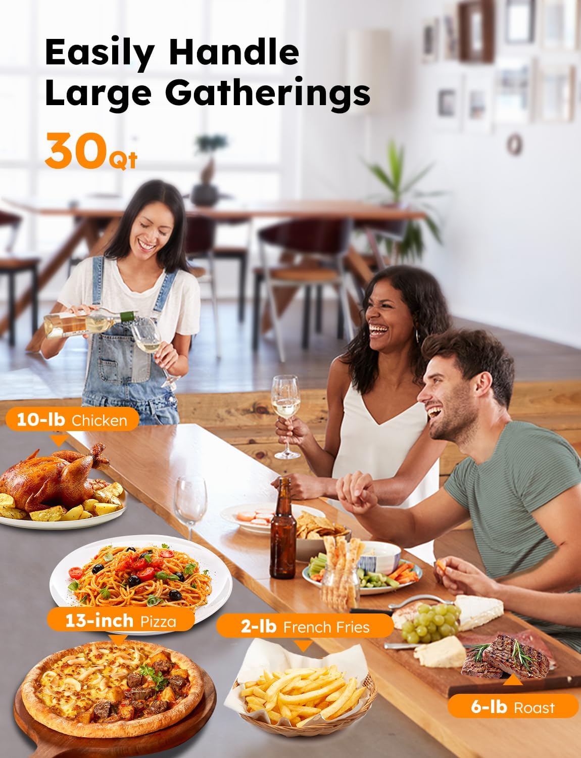 30QT COMPACT SIZE: This toaster oven can easily accommodate two 13-inch pizza, 10-lb Chicken, 6-lb Roast, 2-lb French Fries, making it suitable for large families. Its compact size allows it to fit perfectly in small kitchens, motorhomes, RVs