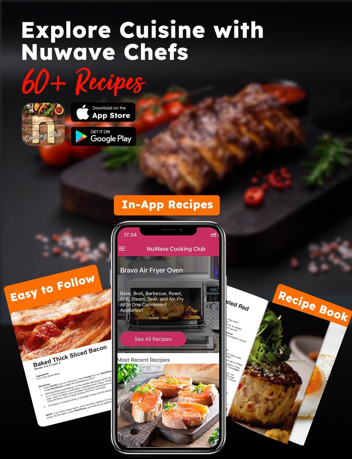 TRUE CHAR GRILLED FLAVOR: The Bravo Air Fryer Grill Combo comes with a professional grill plate that authentically replicates char-grilled flavor and diamond-shaped marks. The reversible grill/griddle features a ceramic non-stick coating and dual drip spouts to drain excess oil and water, ensuring perfect taste and texture. This summer, enjoy cool and relaxed grilling indoors or outdoors with Nuwave.