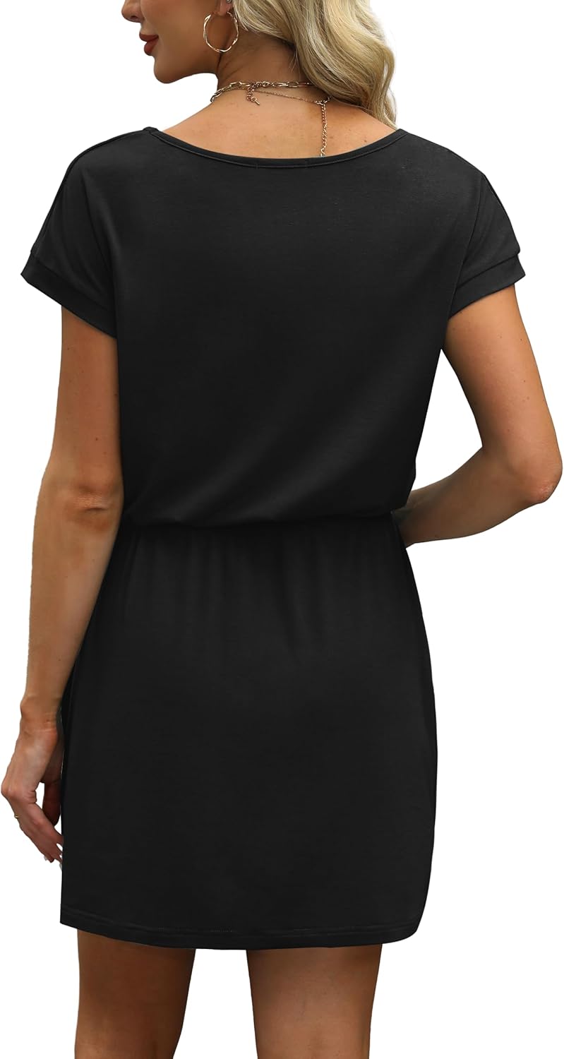 OFEEFAN Summer Dresses for Women 2025 V Neck T Shirt Casual Mini Dresses Tie Waist Sundresses with Pockets