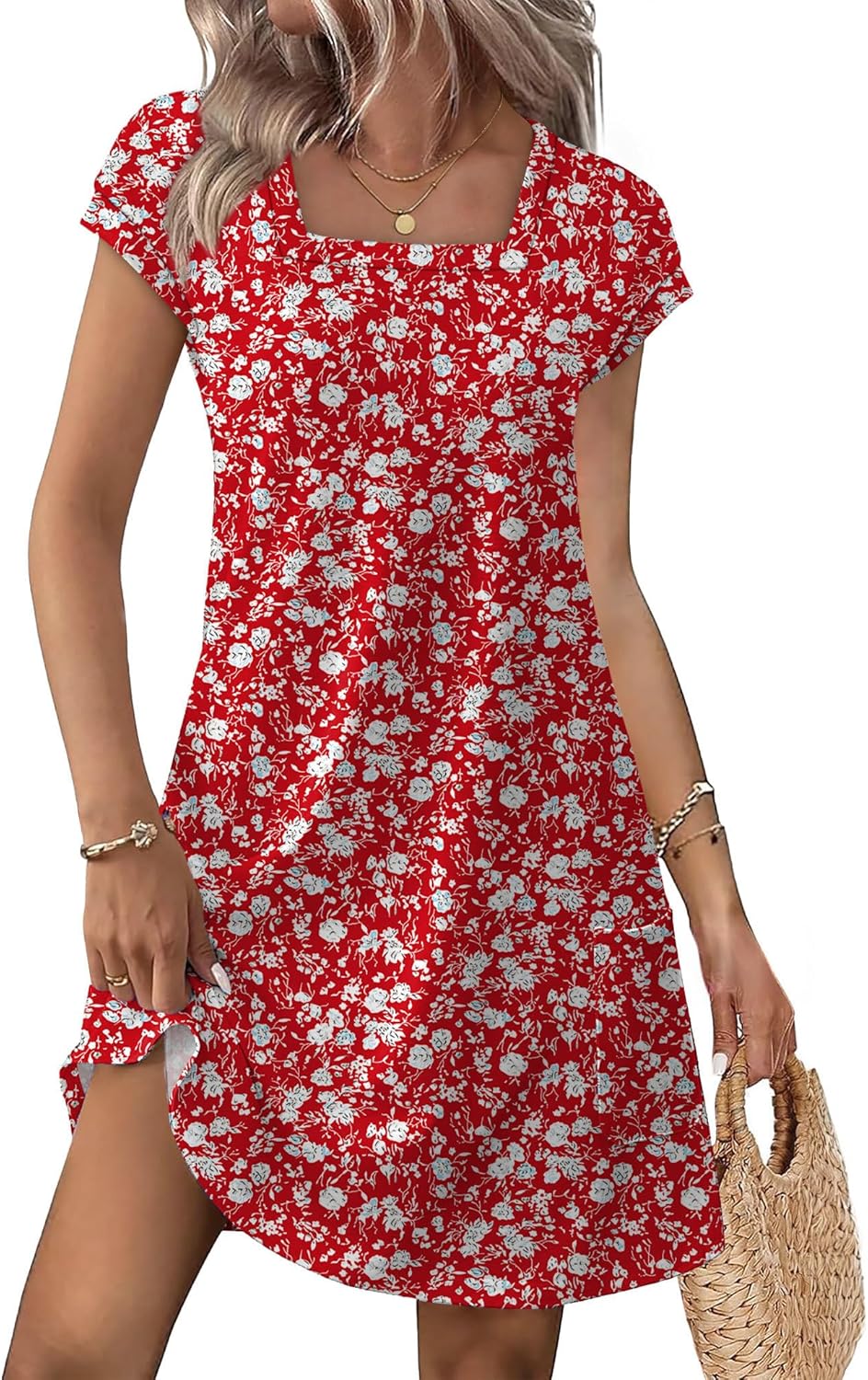 OFEEFAN Summer Dresses for Women 2026 Loose Square Neck Cap Sleeve Casual Beach Vacation Tshirt Dress Sundresses with Pockets