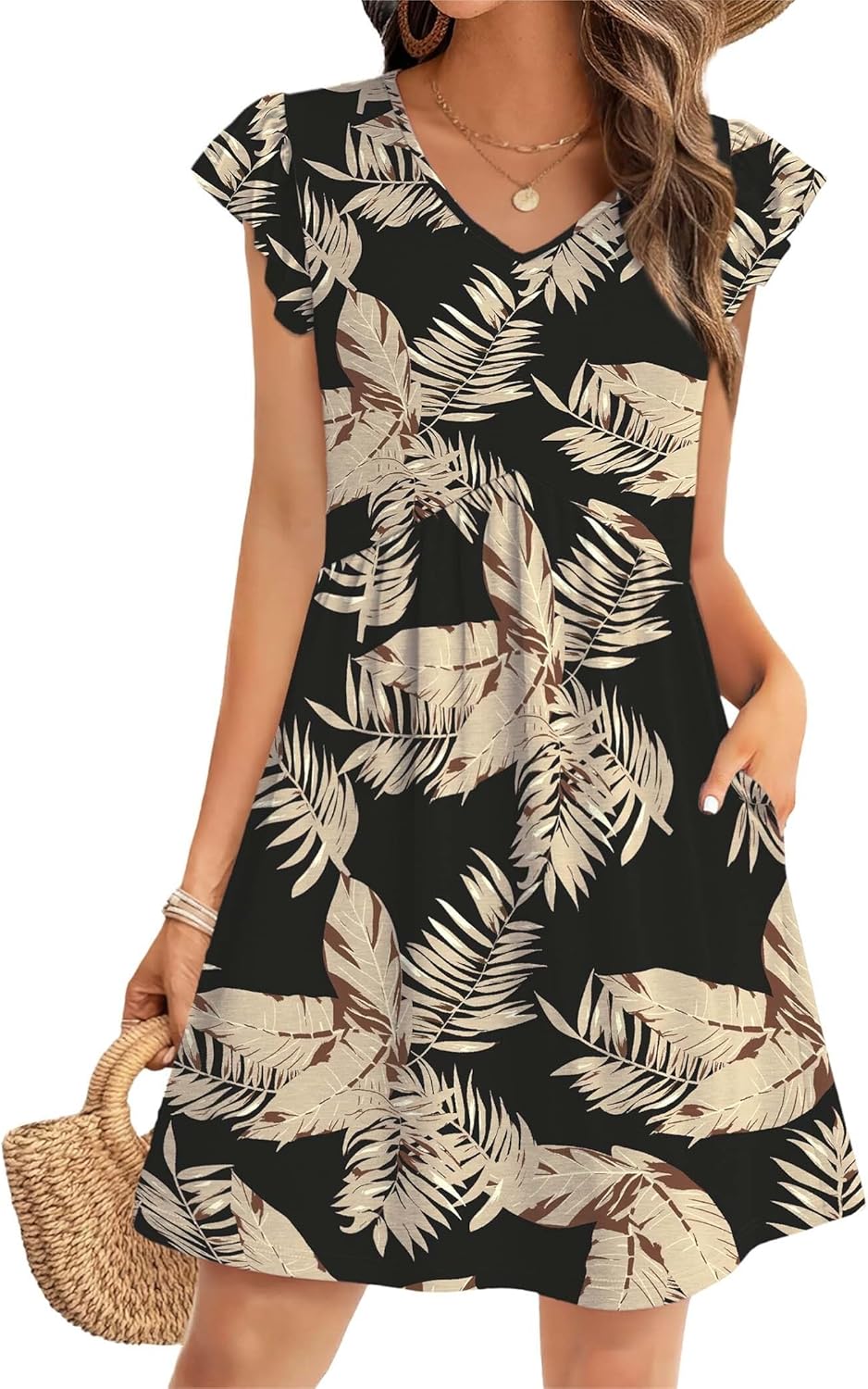 OFEEFAN Summer Dresses for Women Beach Vacation Clothes V Neck Ruffle Sleeve Babydoll Dress Elegant Classy Sundress