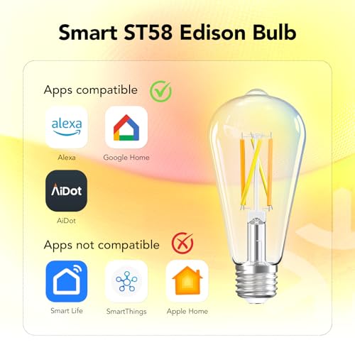 【Smart WiFi Edison Bulbs】Group control multiple smart bulbs with AiDot APP wherever you are, no need to worry about forgetting to turn off the LED ST58 edison bulbs. Keep your home safe and secure, even when you’re on vacation. Program timers or schedule to automate your entire smart home lighting setup via AiDot App. No Hub Required. (Note: Only support 2.4GHz)